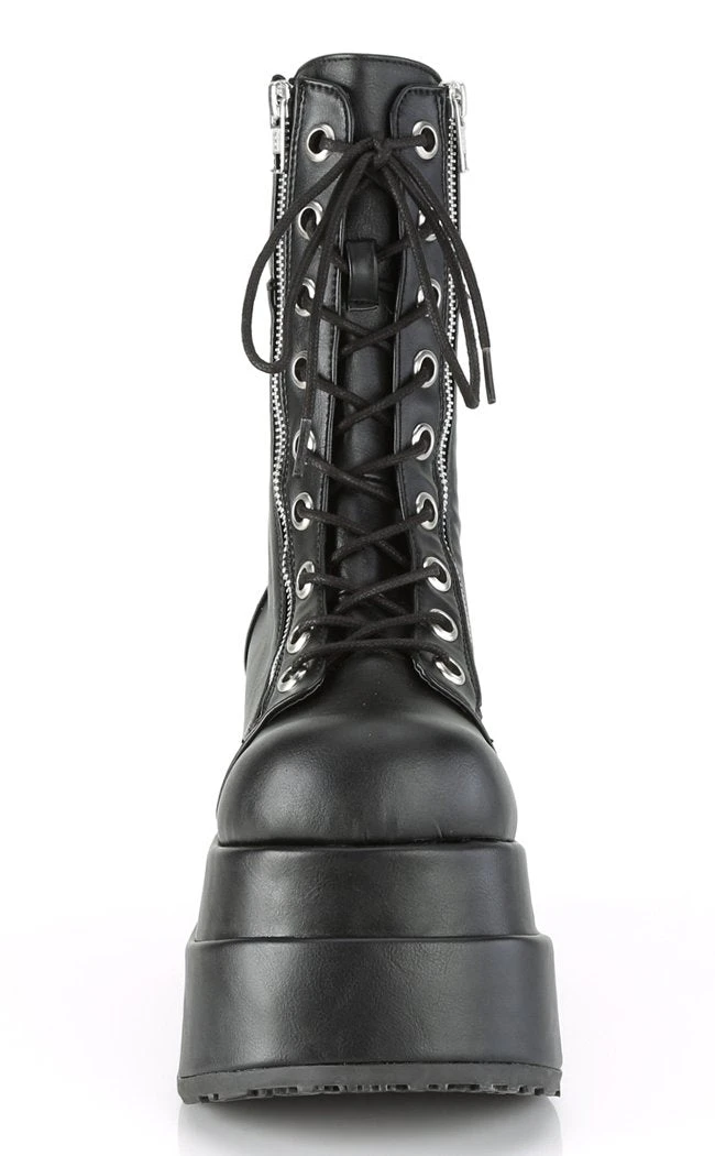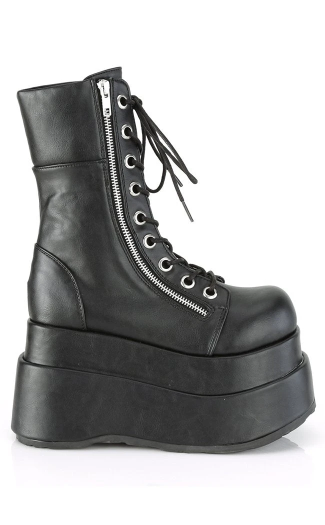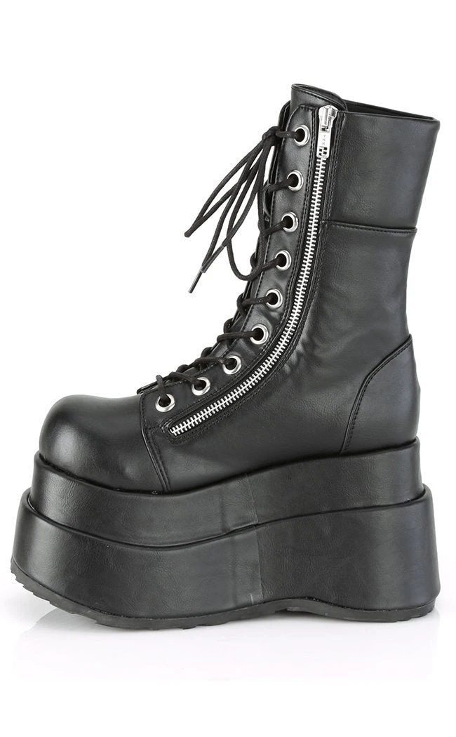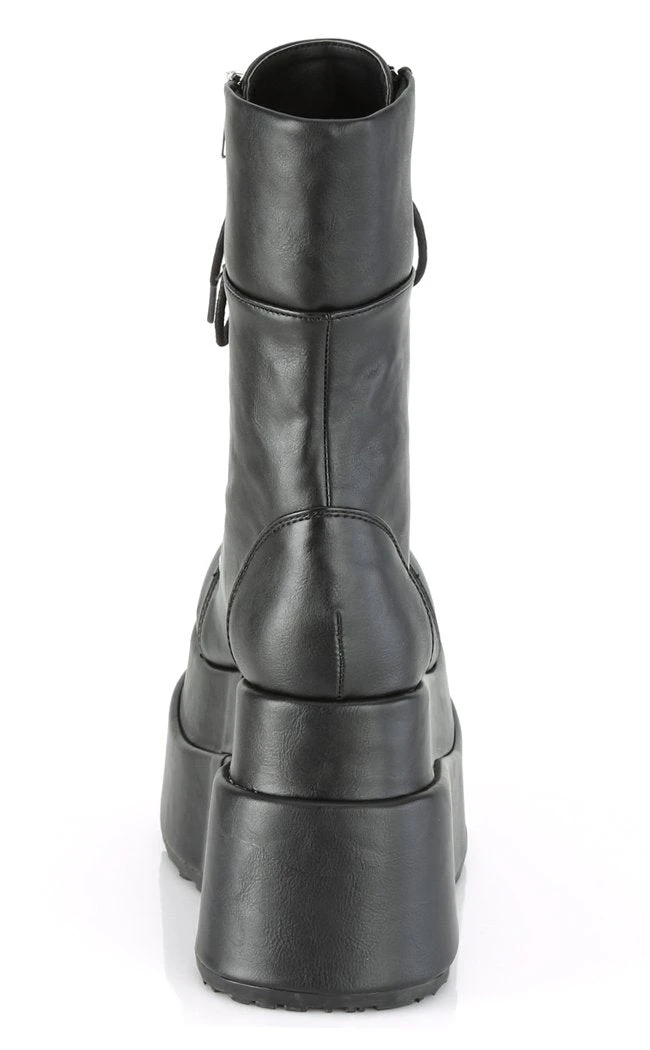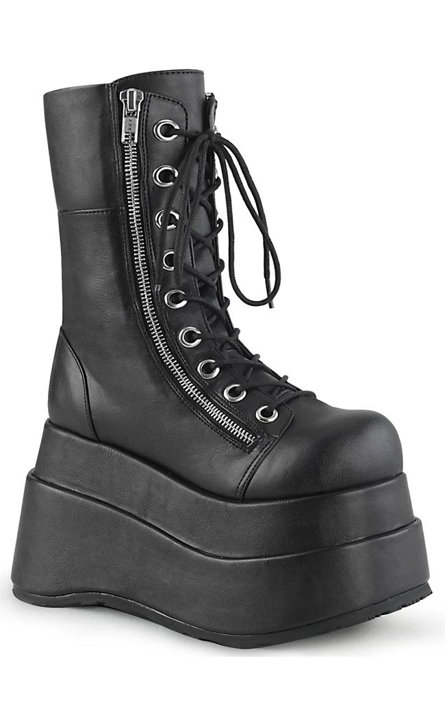 These mid-calf platform boots feature a chunky platform sole and inner and outer zip closure.