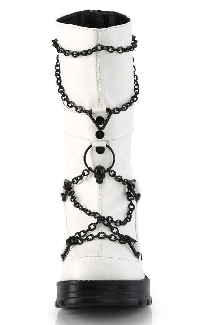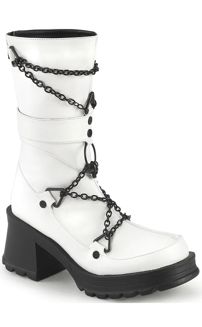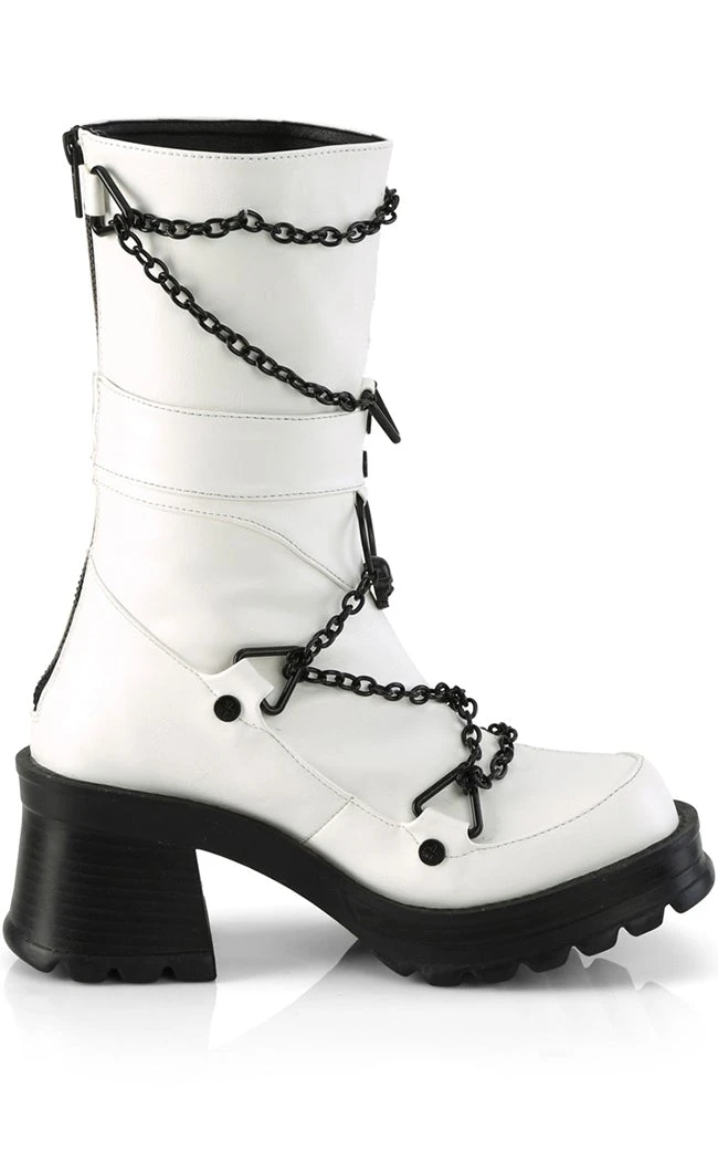 Get yerself in a bratty mood! The BRATTY-120 boots are a mid calf length and feature chains, O rings, a skull charm and rear zip.   These babies are perfect for everyday wear so you can act out in comfort and style!