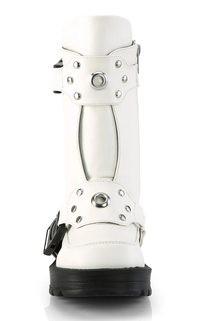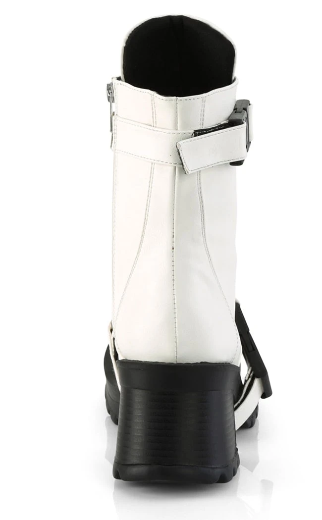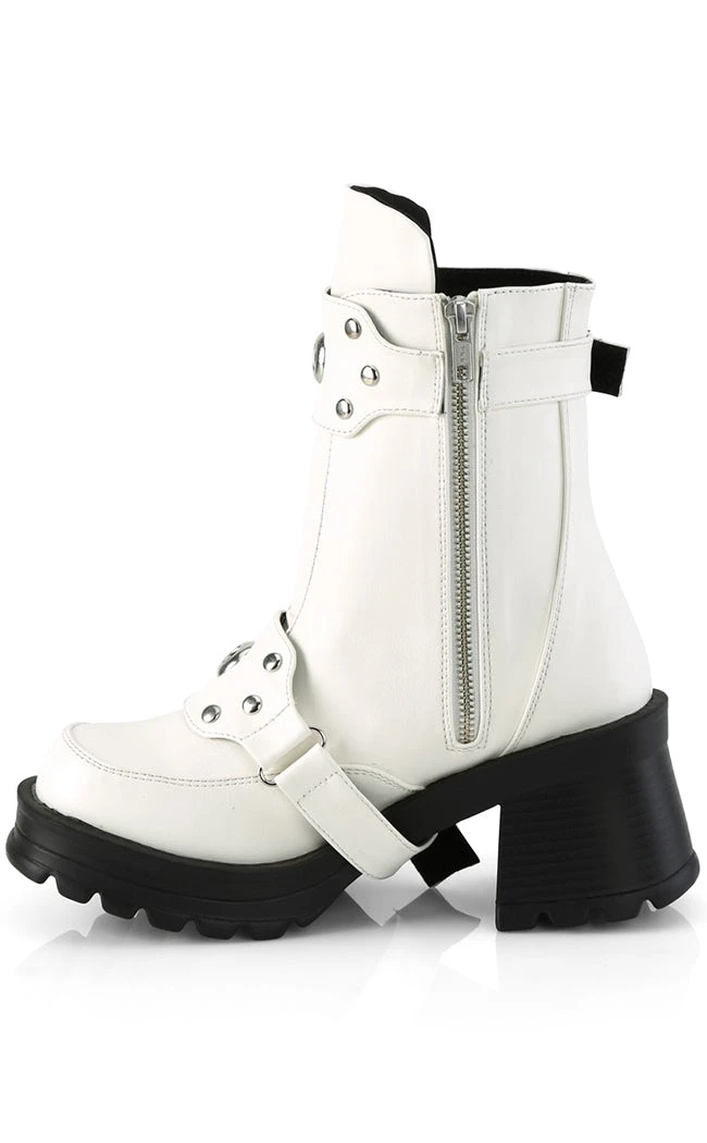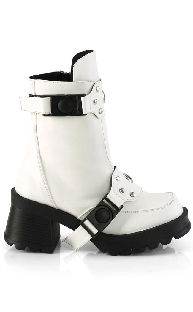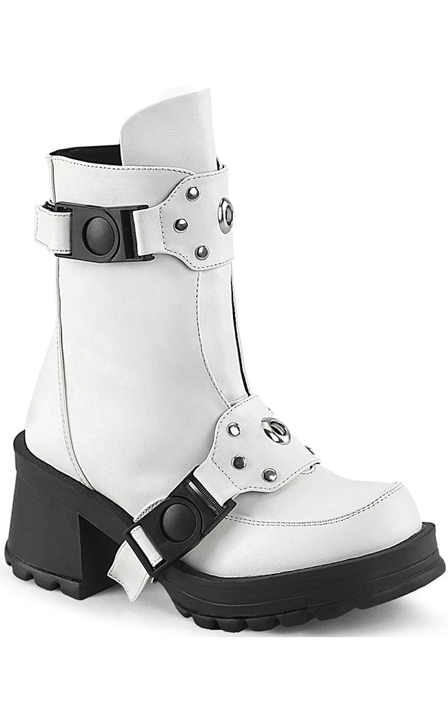 Get yerself in a bratty mood! The BRATTY-56 ankle boots feature panels decked out in studs and eyelets, held in place with futuristic quick release buckles.