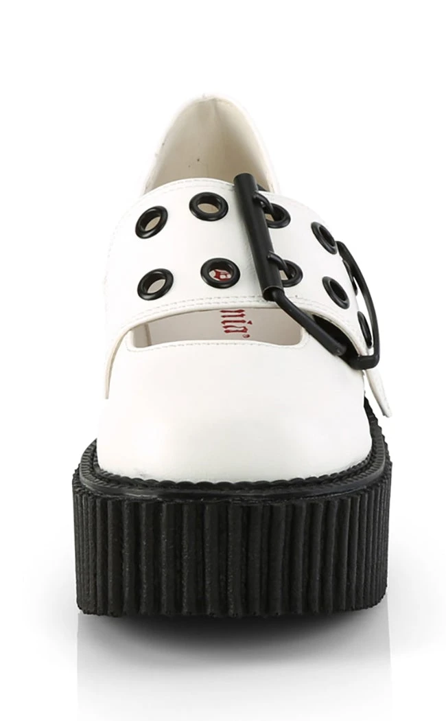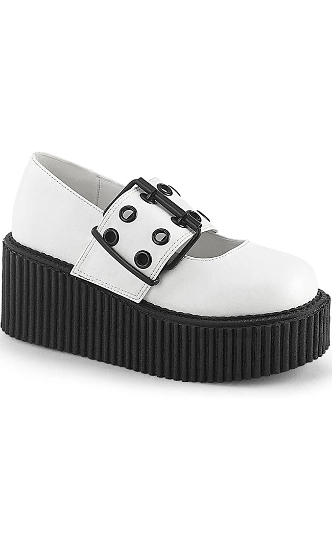 The CREEPER-230 flatforms are an edgy alternative to yer traditional Mary Janes with a wide eyelet strap and the trademark creeper sole for all-day comfy wear.