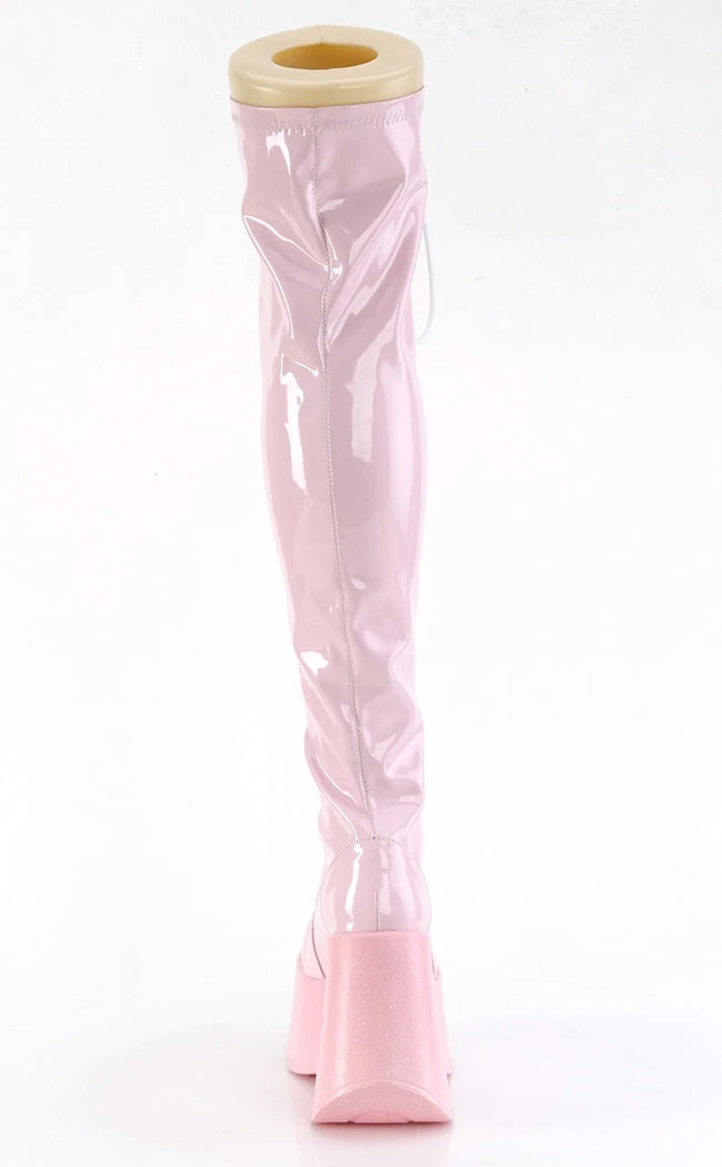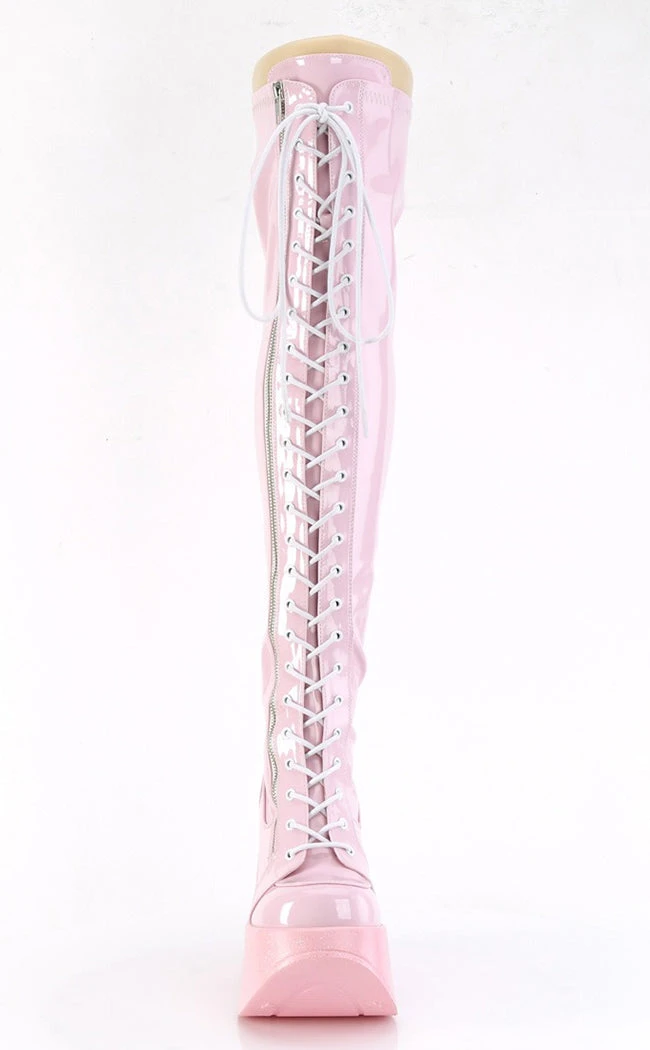 Baby, you’re a star! The DYNAMITE-318 boots are wicked thigh-highs made with stretch faux leather that tops a glittering wedge, securing with a full zip & lace-ups.