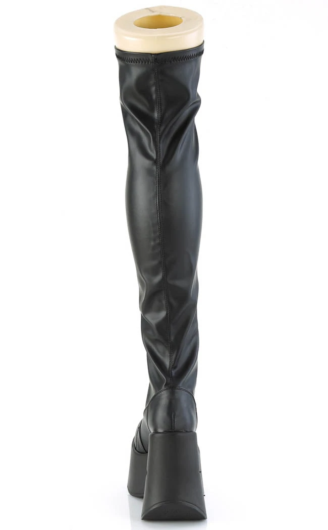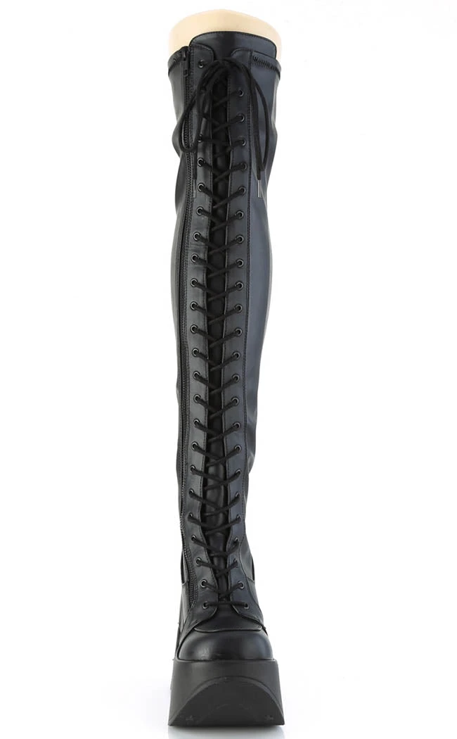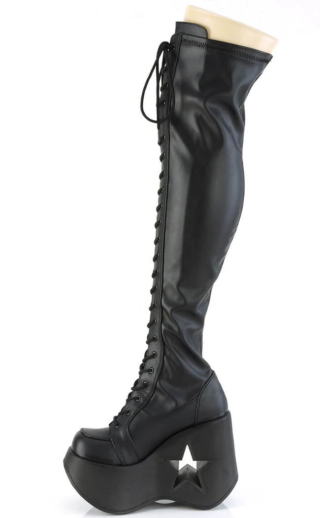 Baby, you’re a star!  The DYNAMITE-318 boots are wicked thigh-highs made with stretch faux leather that tops a glittering wedge, securing with a full zip & lace-ups.