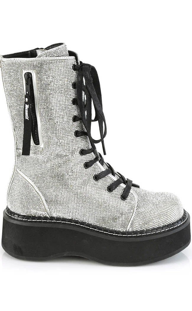 Here are a series of boots for true fans of the Chunk™. A thick platform to keep you comfy and tall as you stomp through the crowds. These babies are covered in silver, glittery rhinestones for that xxxtra flare!