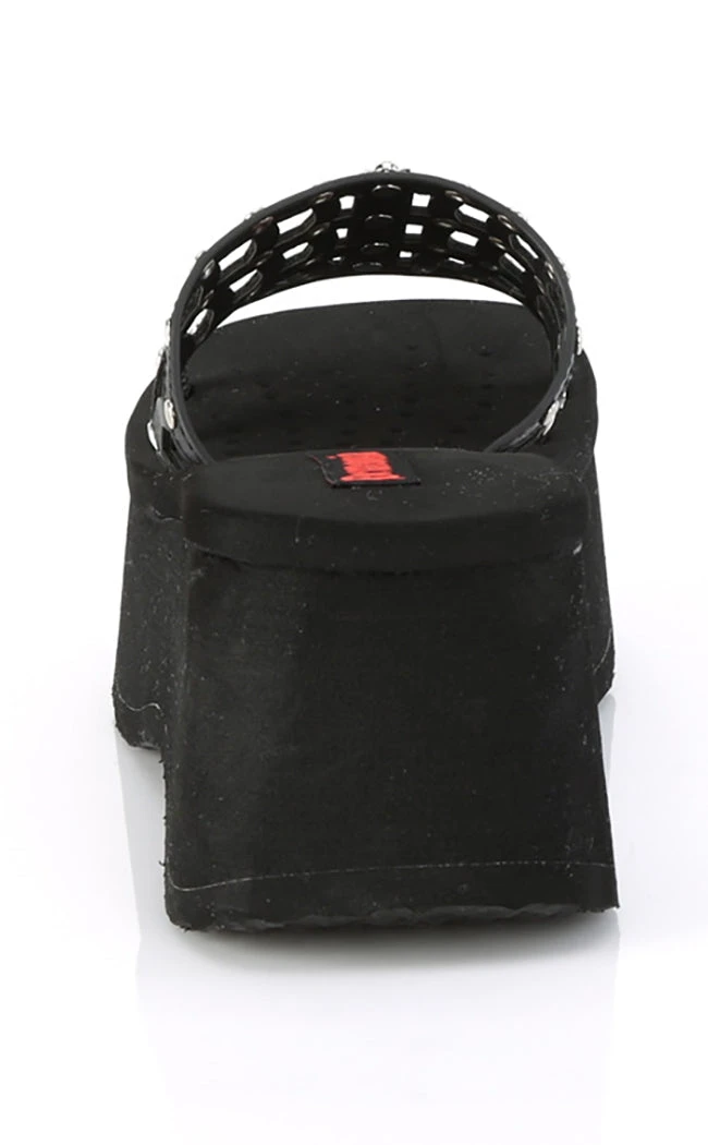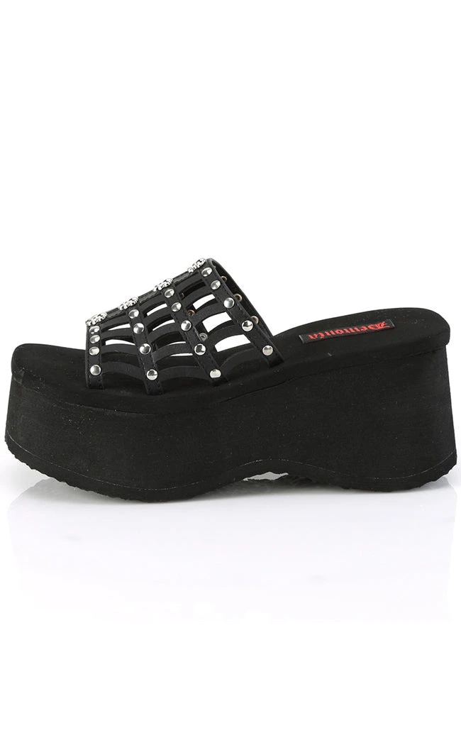 Stay Spooky™ this summer with the FUNN-13 sandals!  These babies make a statement with the openwork spiderweb strap, decked out with studs and metal spider charms. Super casual, super comfy, super cute!