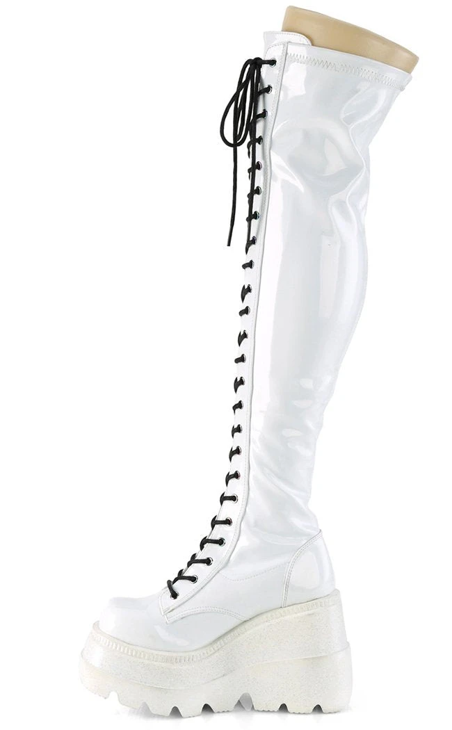 All the way up, baby! These tiered platform wedge boots are a cute variation on Demonia’s other chunky wedge collections. This boot goes thigh high and has a black metal side zip for easy access 😉
