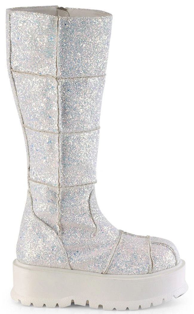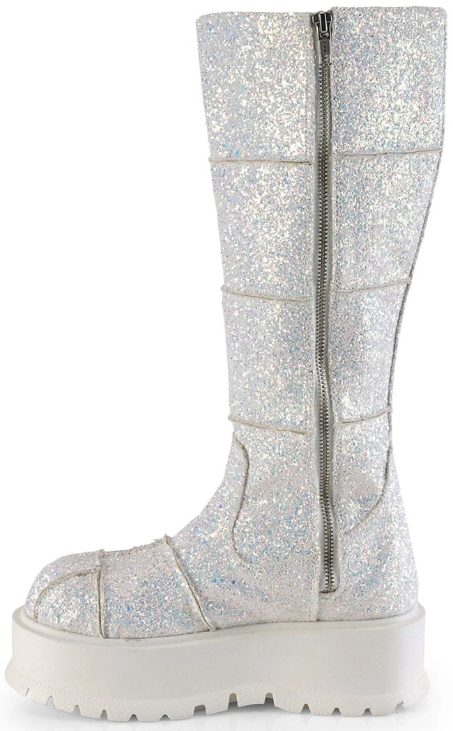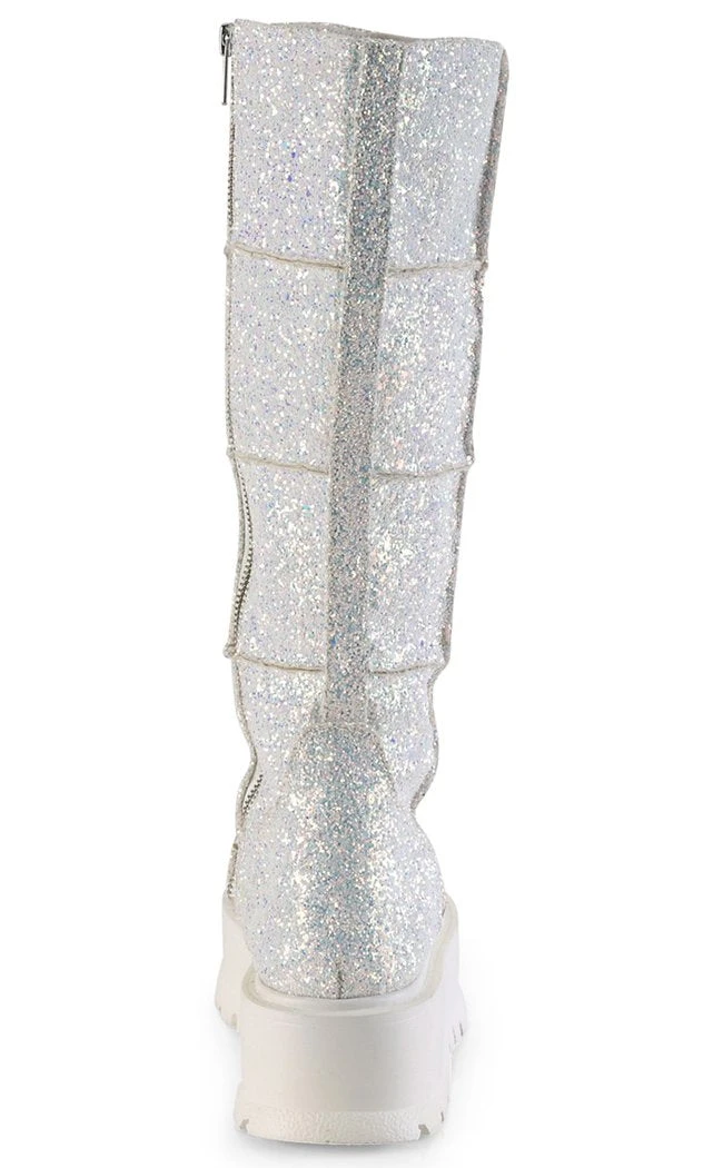 White glittery vegan leather knee length boots with patching and a mini flatform.