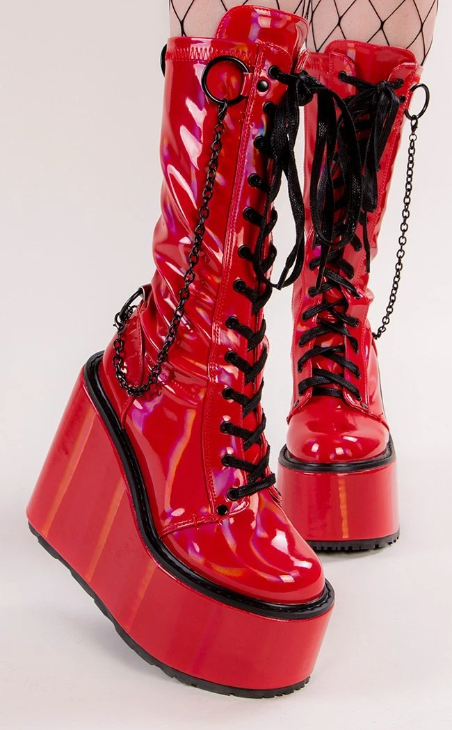 Come out swinging with the Swing 150 boots! Shining sleek in holo red, these babies feature the iconic Swing platform wedge, lace-ups and some extra punk chains. Perfect for cyber vamps and alien punks!