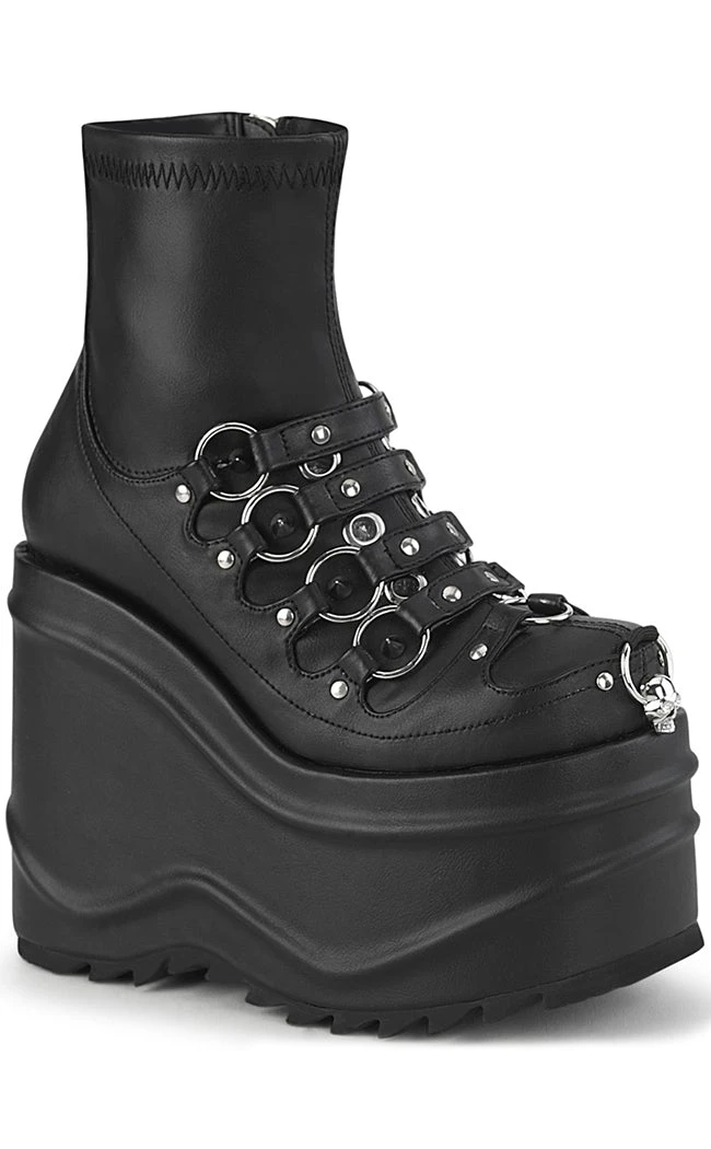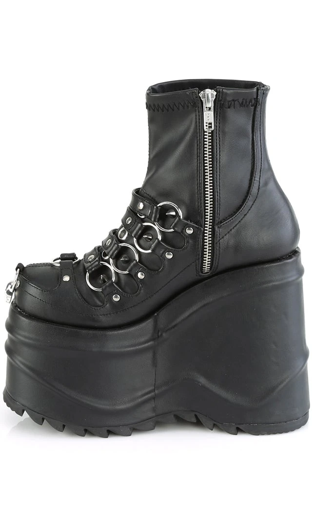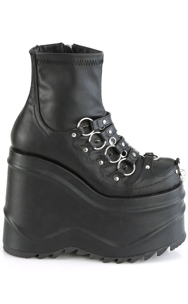 Make waves baby! The WAVE-110 ankle boots feature a killer platform wedge, plenty of O rings with straps and a comfy stretch PU upper. Â