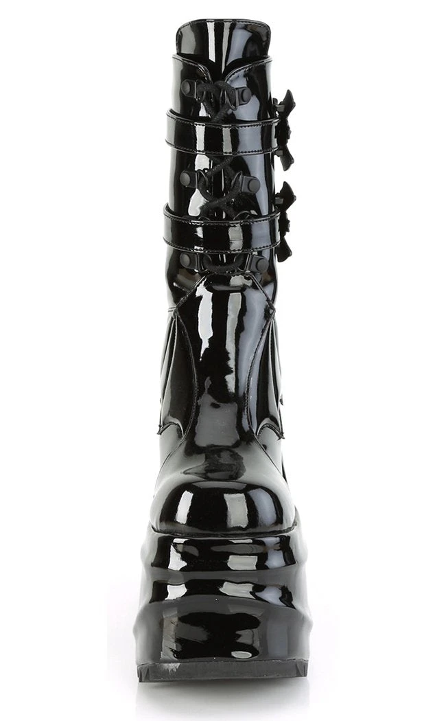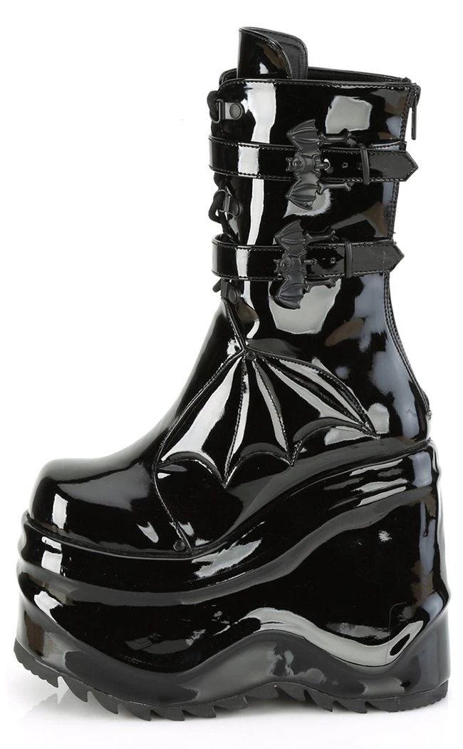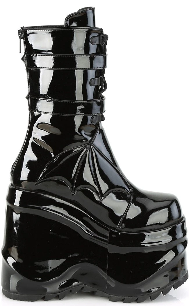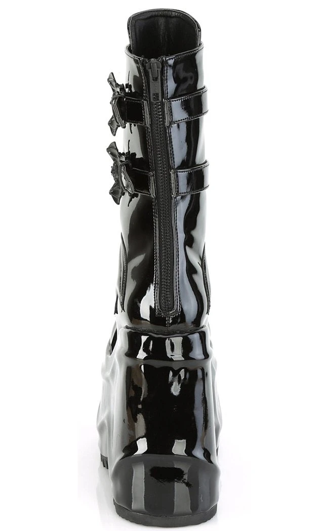 OK but BATS?!! These ridiculously chonky wedge boots are decked out in batty buckles, straps and a faux leather bat panel.Â