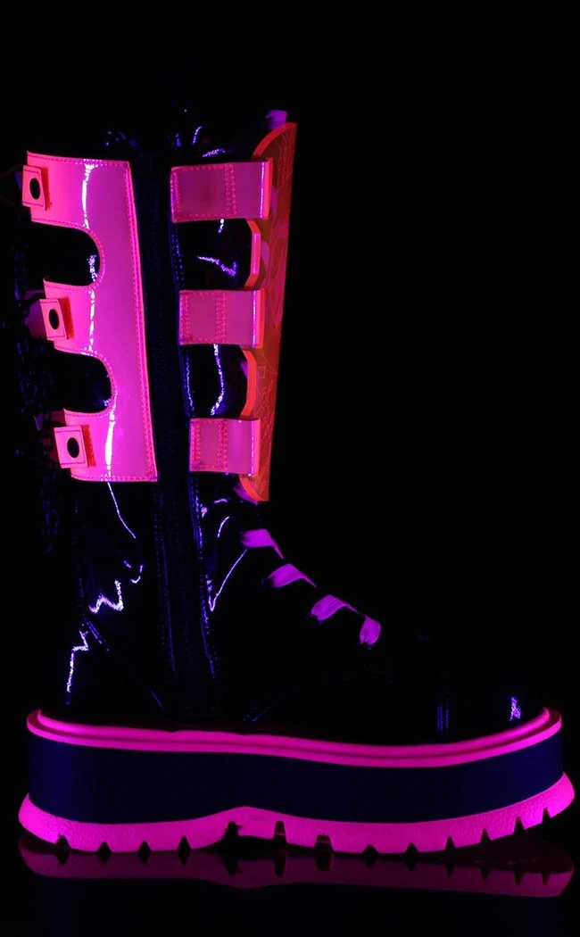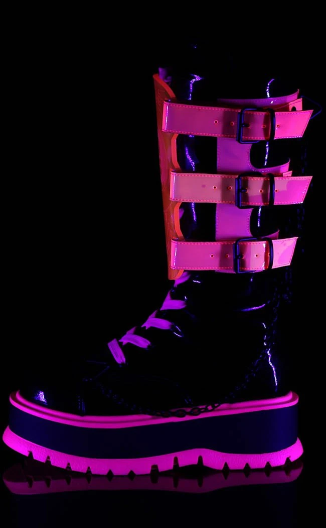Glossy black patent, UV pink laces, panels and buckles bring the rave and the pitch black chains bring the punk. Kick against the pricks in hyper rave comfort!