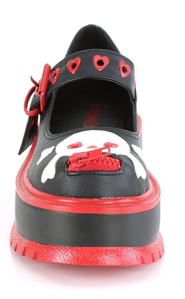 Emo forever! The awesome SLACKER-27 flatform Mary Janes feature a cute skull design on the toes, complemented by heart eyelets and red trims on black vegan leather.