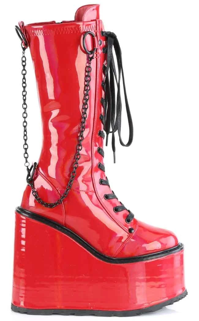 Come out swinging with the Swing 150 boots! Shining sleek in holo red, these babies feature the iconic Swing platform wedge, lace-ups and some extra punk chains. Perfect for cyber vamps and alien punks!