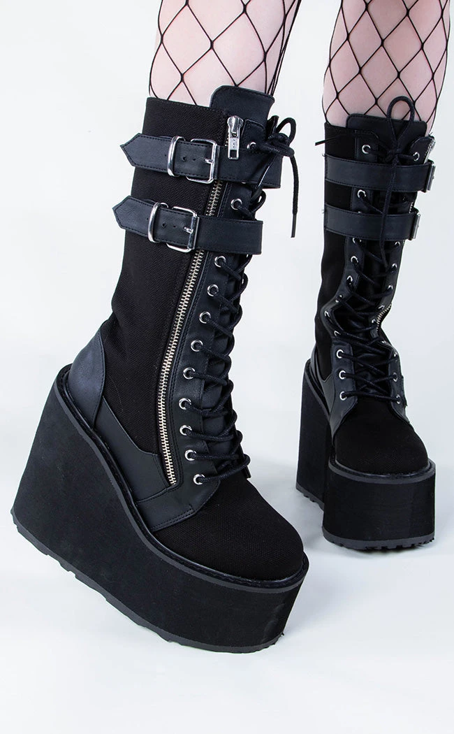 Swing your way into the club with this series of platform wedged boots and shoes, with buckles and straps and decals galore!