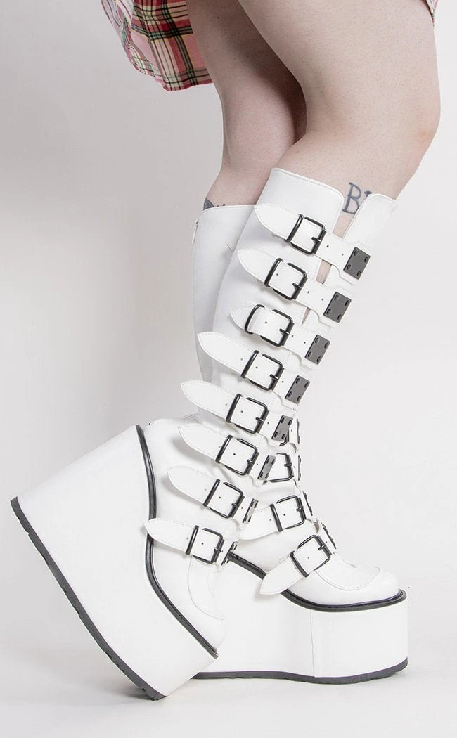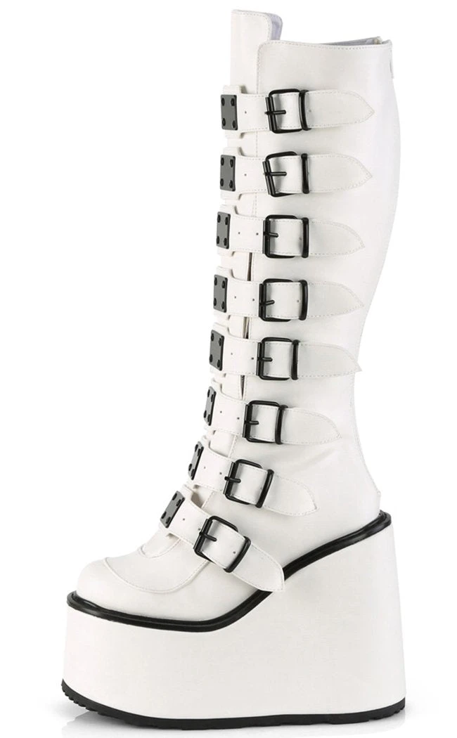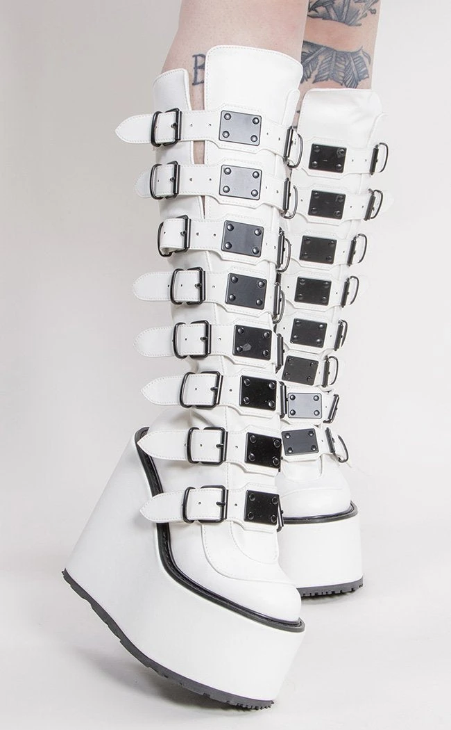Swing your way into the club with this series of platform wedged boots and shoes, with buckles and straps and decals galore!