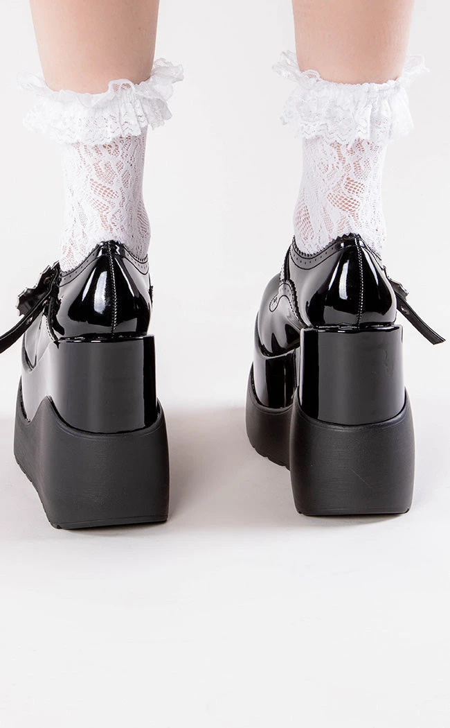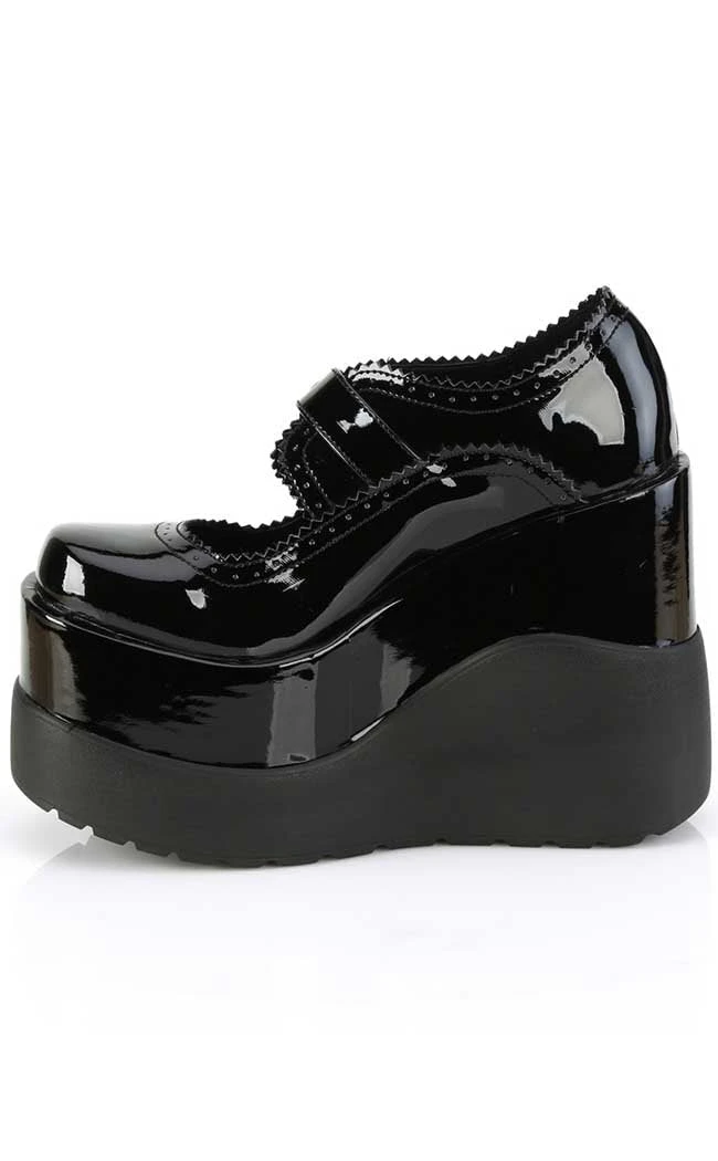 Enter the void! The VOID-38 Mary Janes feature a killer platform wedge, securing with a strap and spiderweb heart buckle. So goth and cute! Â