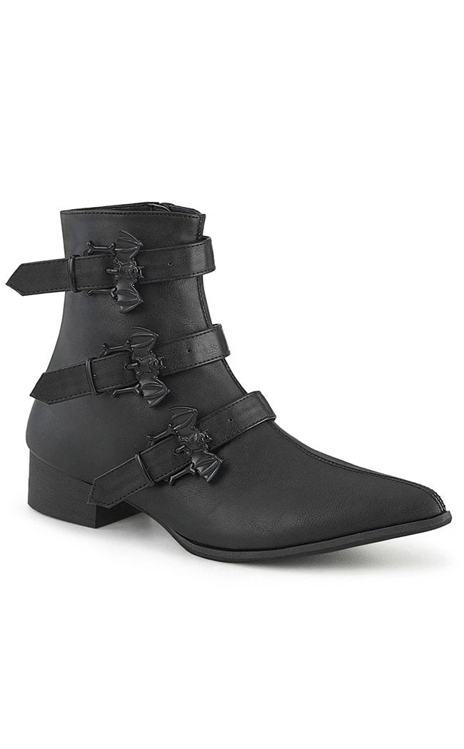 Put some magic in your step! The WARLOCK-50-B boots are your classic winklepickers with a twist: the straps secure with spooky bat buckles for an extra touch of gothic charm. The boots close with a side zip for easy on/off.