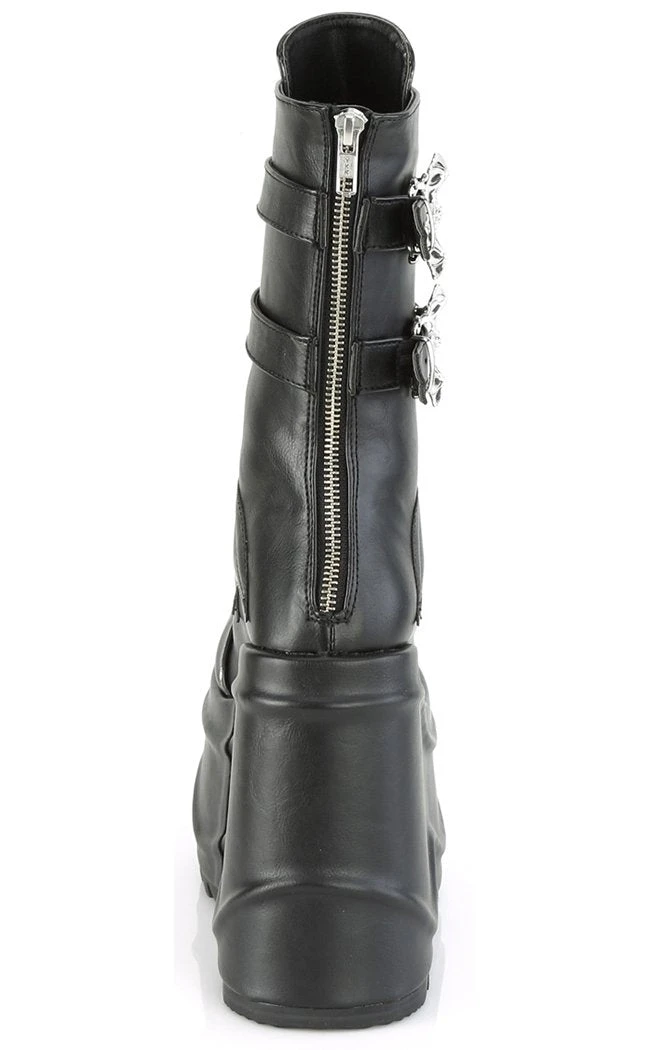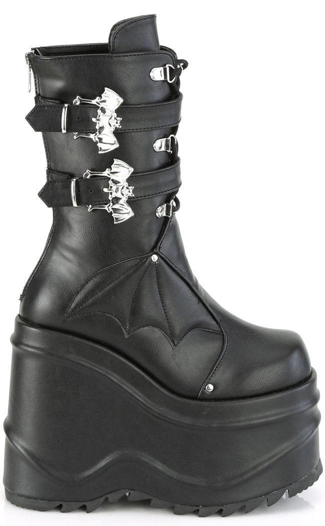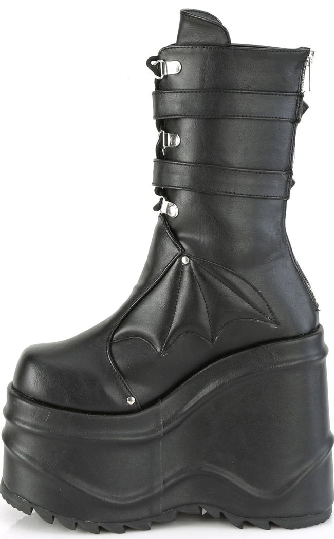 OK but BATS?!! These ridiculously chonky wedge boots are decked out in batty buckles, straps and a faux leather bat panel.Â