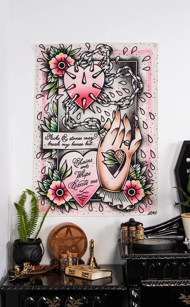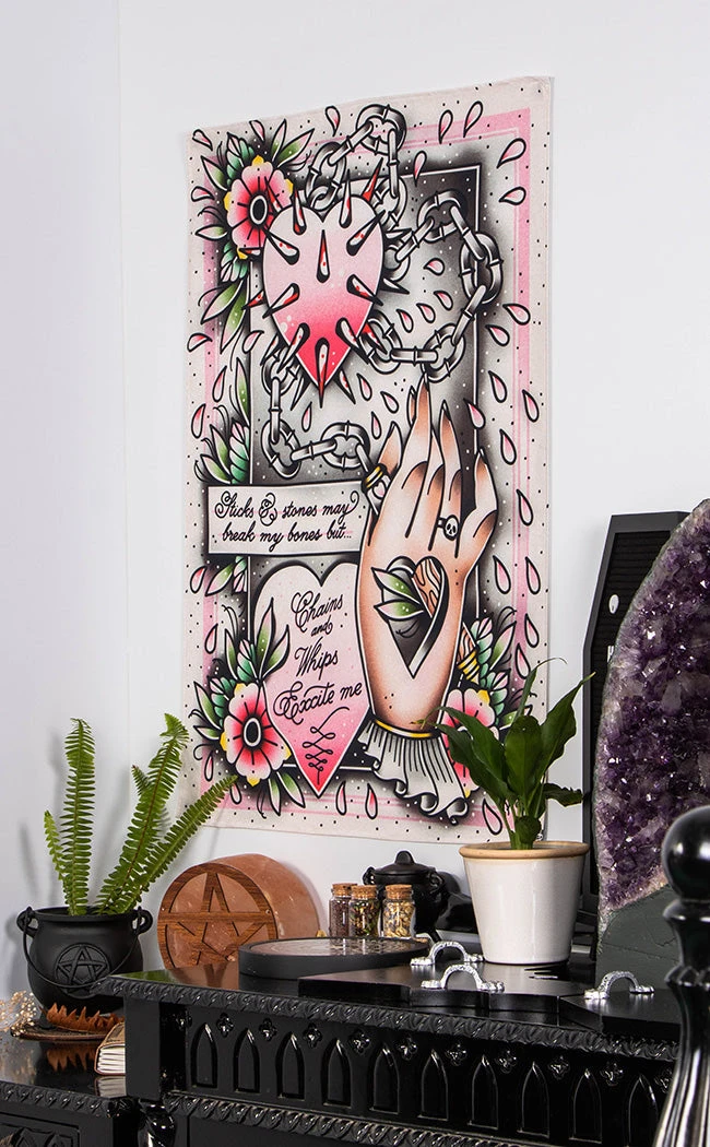 Bring a tasteful touch of bondage to yer walls with the Chains & Witch Tapestry! This pastel marvel features gorgeous art by Ella Mobbs including tattoo style motifs, spikes, chains and the words “Stocks & stones may break my bones but whips and chains excite me”.