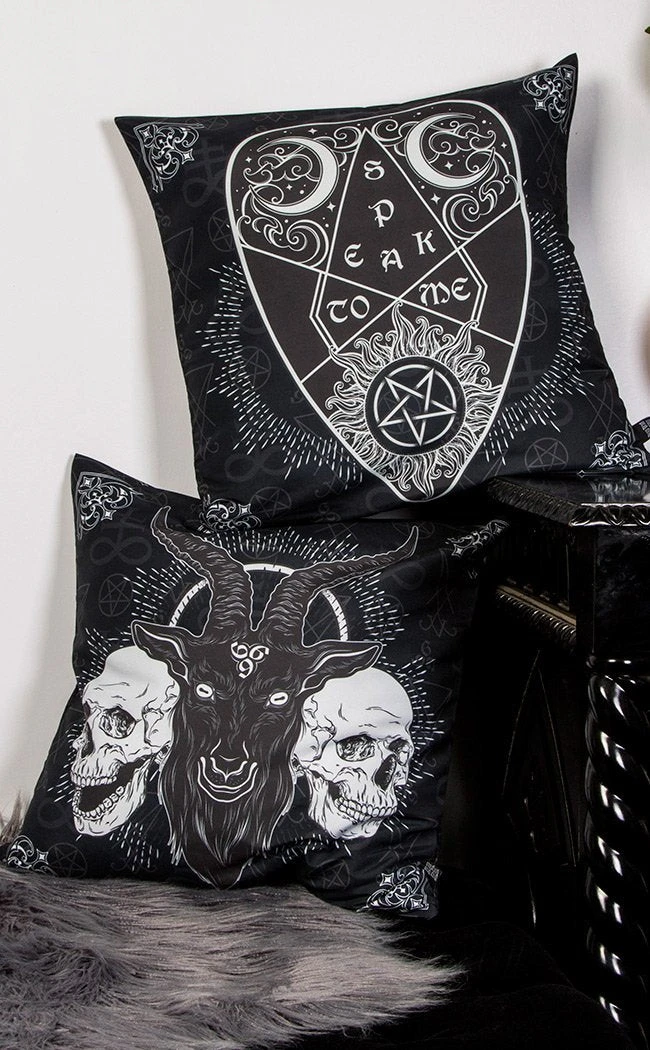Bring some class to your crypt! This set of 2 large cushion covers is perfect for your bed or lounge. Each side features different designs: one with Baphomet and skulls, the other with a planchette.
