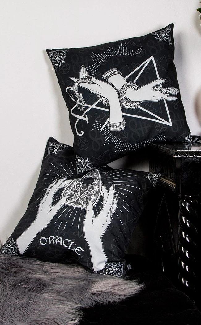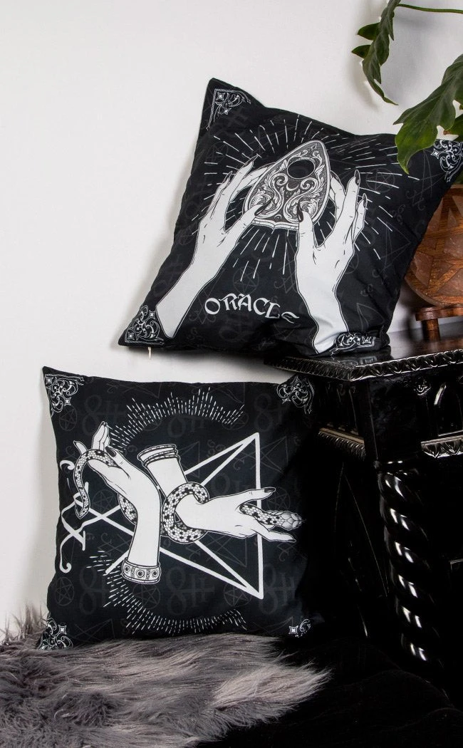 Bring some class to your crypt! This set of 2 large cushion covers is perfect for your bed or lounge. Each side features two distinct art prints: one of hands holding a snake and the other of hands holding a planchette.