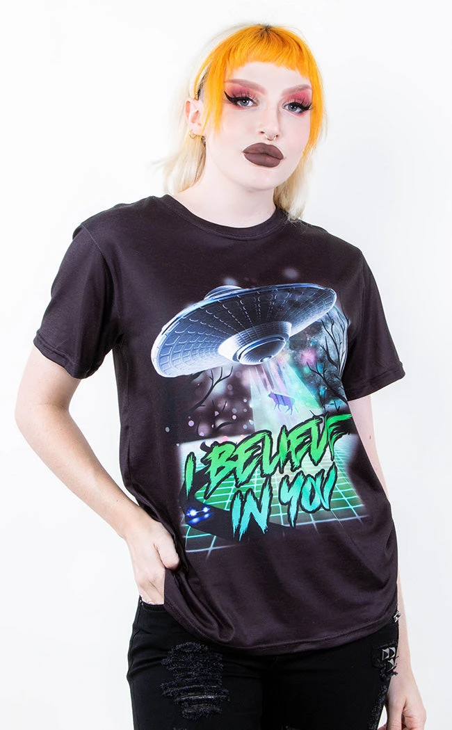 Prepare for close encounters in the I Believe In You Tee! This pitch-black tee is soft n cosy, decked out with a wacko print featuring a UFO abducting a cow and the words “I believe in you”.