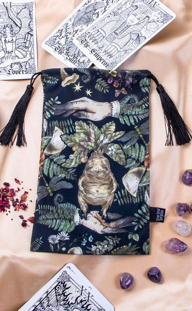 A shrieking storage solution for green witches and herbal alchemists! This cute little bag is made from soft yet sturdy velvet, printed with an adorable mandrake surrounded by botanicals and witchy herbs. The bag secures with a tassel pull, ideal for storing and carrying your tarot deck safely or using as an all purpose bag.