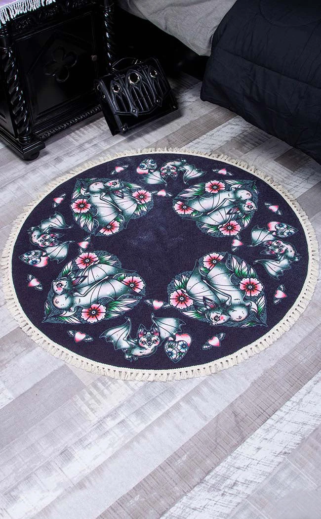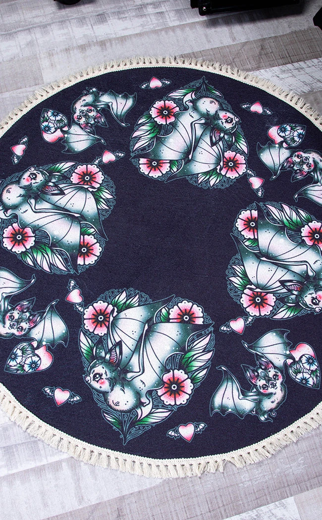 Release the bats in your boudoir with the Night Vision Fringed Rug! This gorgeous round rug features a pastel pattern of flying bats, all trimmed with a fluffy fringe. With non-slip backing, lay this on any kind of flooring in your bedroom, lounge or hall!