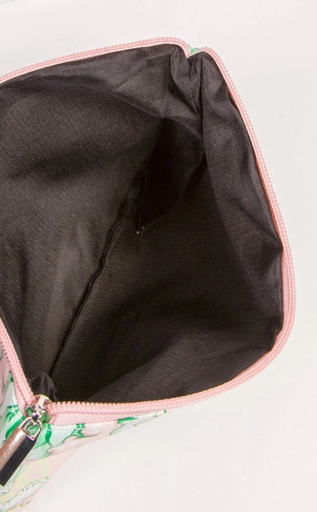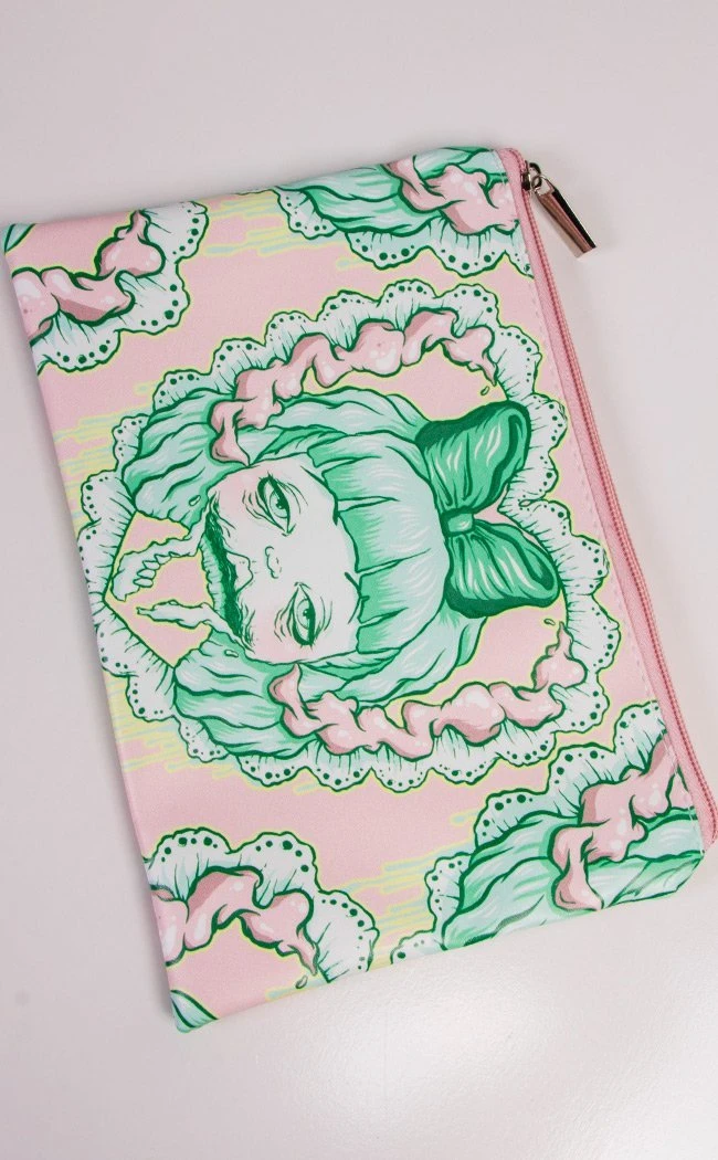Reanimated corpses don’t have to shamble bare-faced, just take your cosmetics on the go! The Rotted! cosmetic bag features pastel artwork of an undead dolly who can make a tube of lippy last longer than most. The bag secures with a zip and opens to black lining.