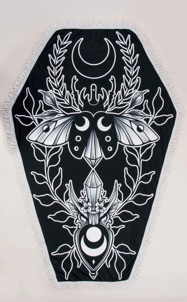 This quick-dry towel is your best accessory for Hot Goth Summer! Two elegant insects with occult trimmings rest upon this coffin towel, trimmed with a soft, fringe border. Lay out on the sands in style, or even use as a personal picnic blanket when you wanna mark plot in the park!