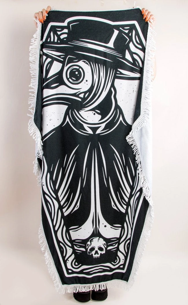 These quick-dry towels are perfect for the summer goth! This cutely morbid coffin towel features a spooky plague doctor surrounded by a fancy fringe. Don’t let the light weight finish fool you – these bad boys are a super absorbent microfibre that will dry you in a snap and not weigh you down when travelling!