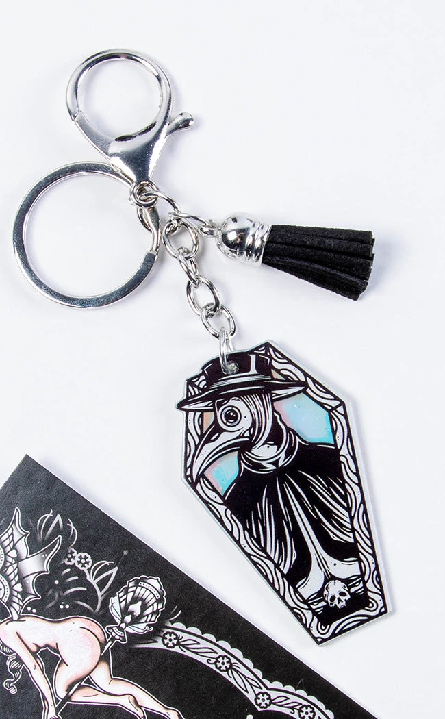 Deck out your bag with the delightfully morbid The Cure Keychain! This keychain has a coffin-shaped charm featuring a plague doctor with a holographic finish for that xxxtra air of rainbow miasma. The chain also comes with a cute black tassel and lobster clast for versatile clipping optionsÂ