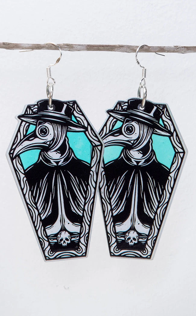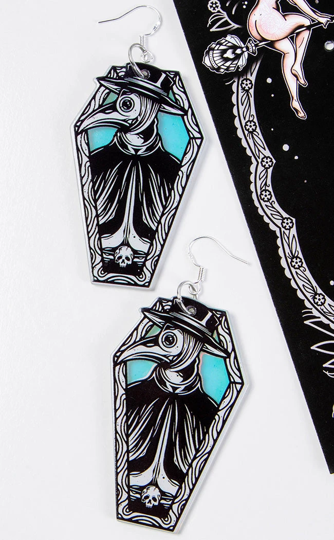 Two plague doctors sit cosily inside coffins in gorgeous monochrome artwork. The earrings have a holographic finish for that xxxtra air of rainbow miasma.Â