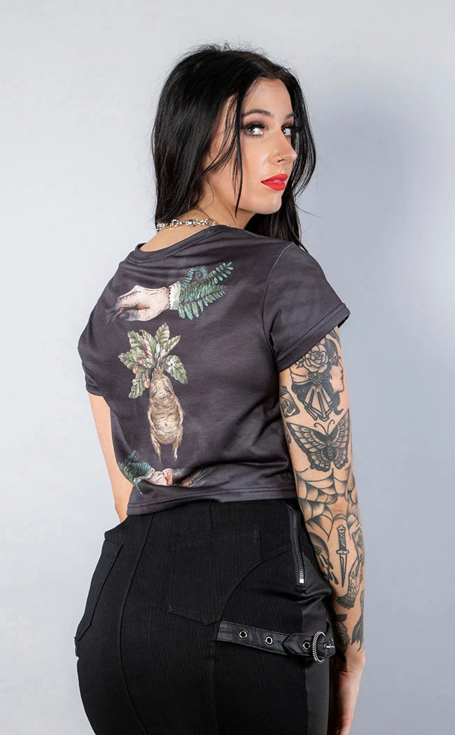 The Mandrake & The Moon Crop Tee is the cutest way to witch up yer wardrobe! This super-soft crop features a round neckline and a length cut to sit at your natural waist to flatter every bod. The front features a dreamy moon print while the back features a mandrake held between two witches’ hands.