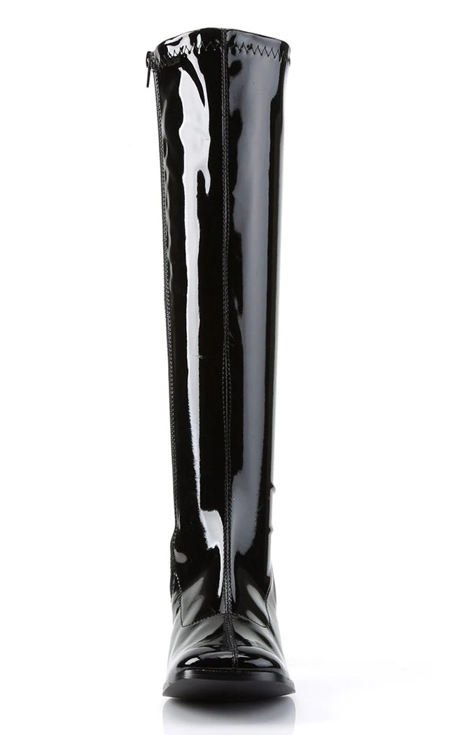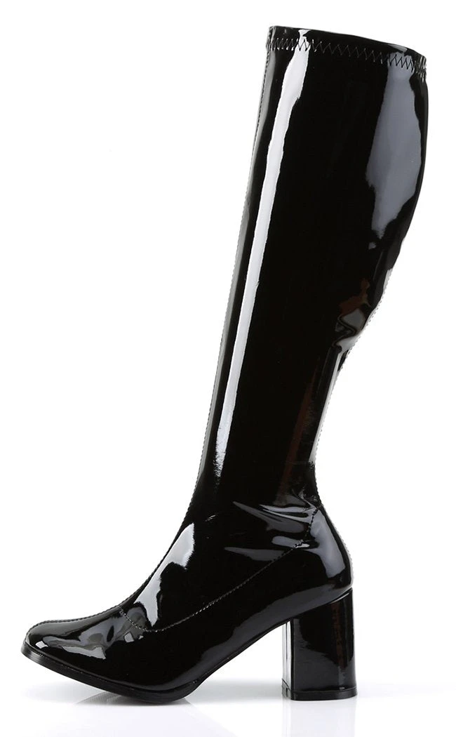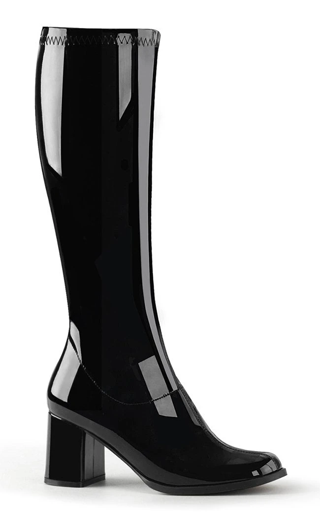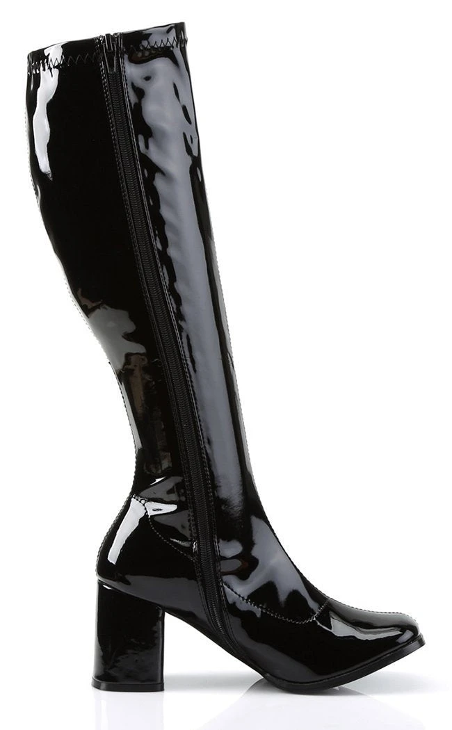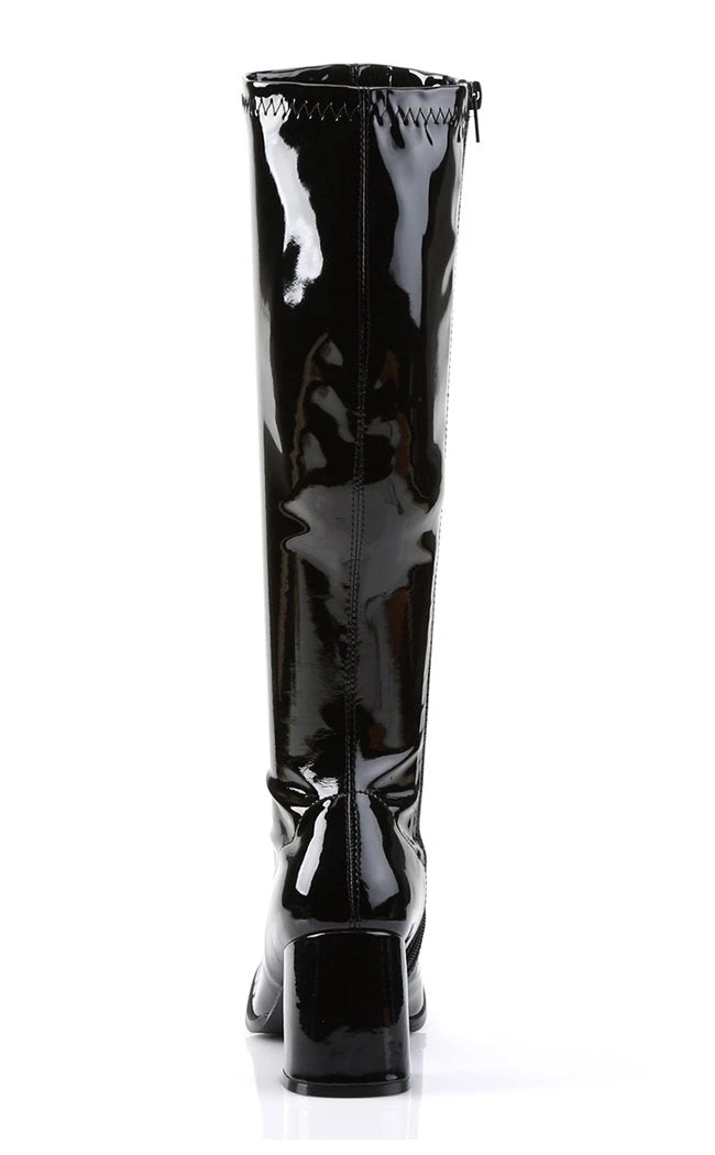 3″ Block Heel Gogo Boot, Black Stretch Pat, Side Zip