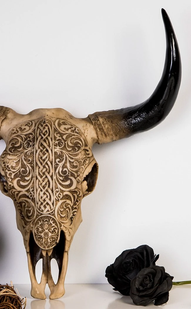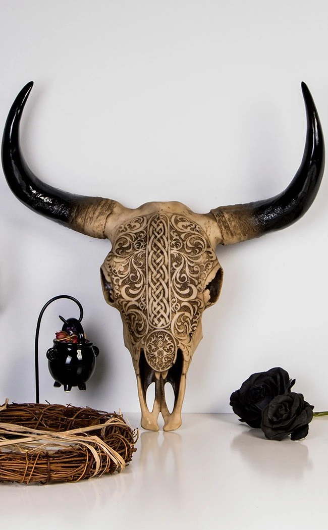A morbid talking piece for the discerning Pagan. This unique wall plaque is modelled after a bleached cow skull, horns blackened as if it attempted to charge blindly into the darkness. Its forehead is carved with intricate filigree and Celtic knotwork, fully prepared for forbidden rites and rituals.