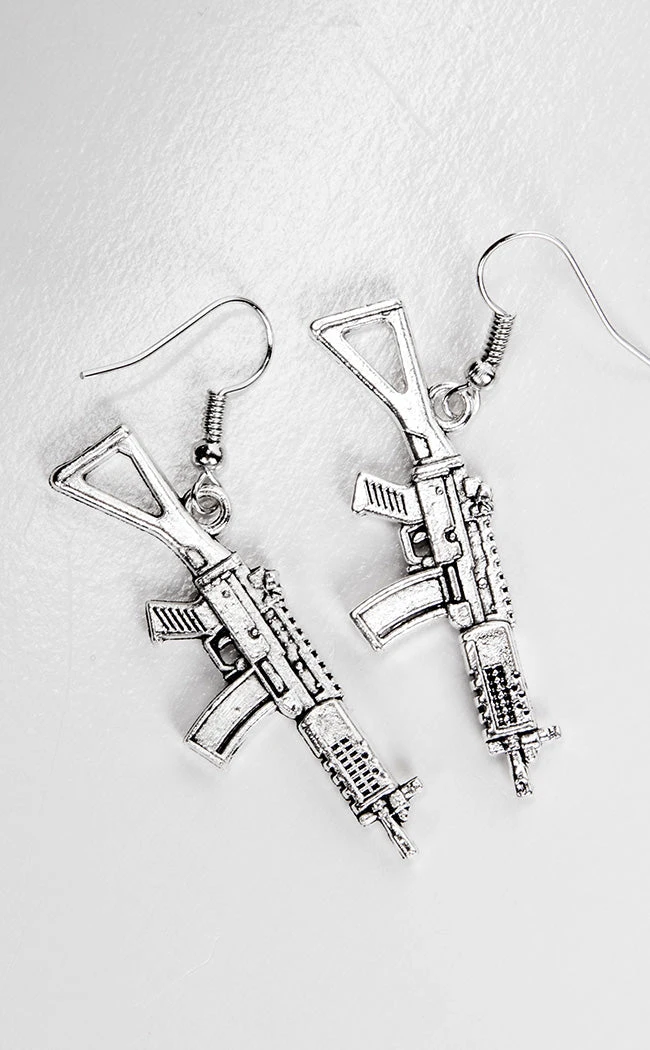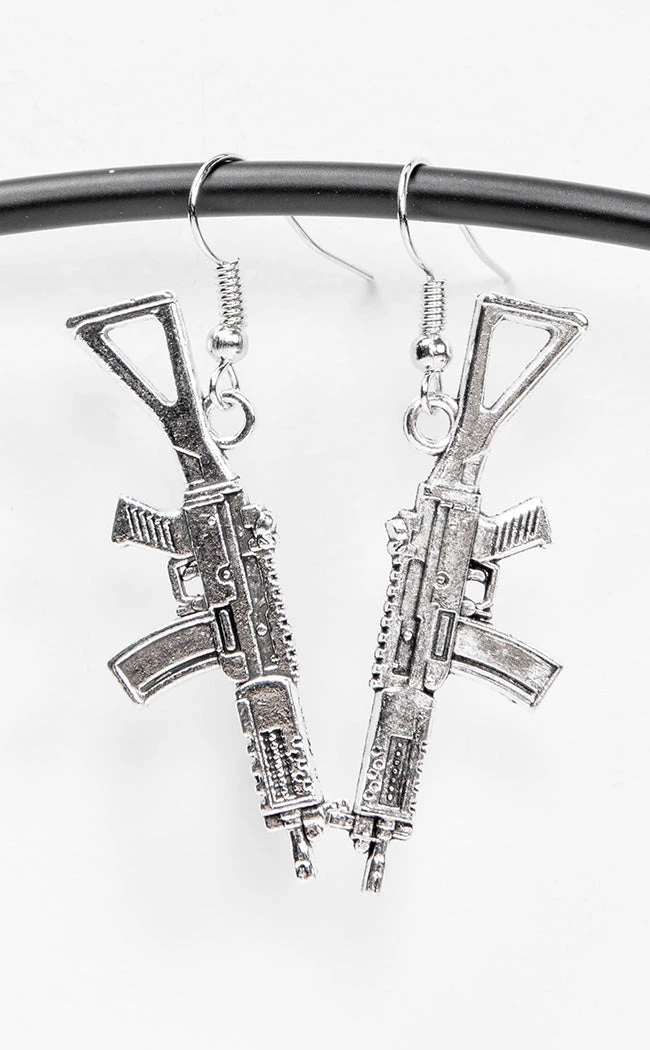 Look effortlessly badass in the Armed & Dangerous Earrings! These babies are shaped like assault rifles, finished in silver and hanging from hook fastenings.