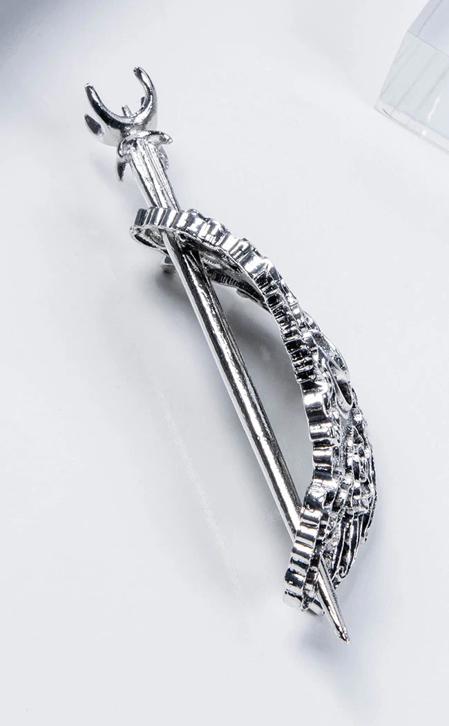 Let the sky fall on your shining locks with the Celestial Hair Pin! This beautiful pin features a sheath that forms a shining moon and a clouded sky that secures with a pin-shaped to look like a staff.