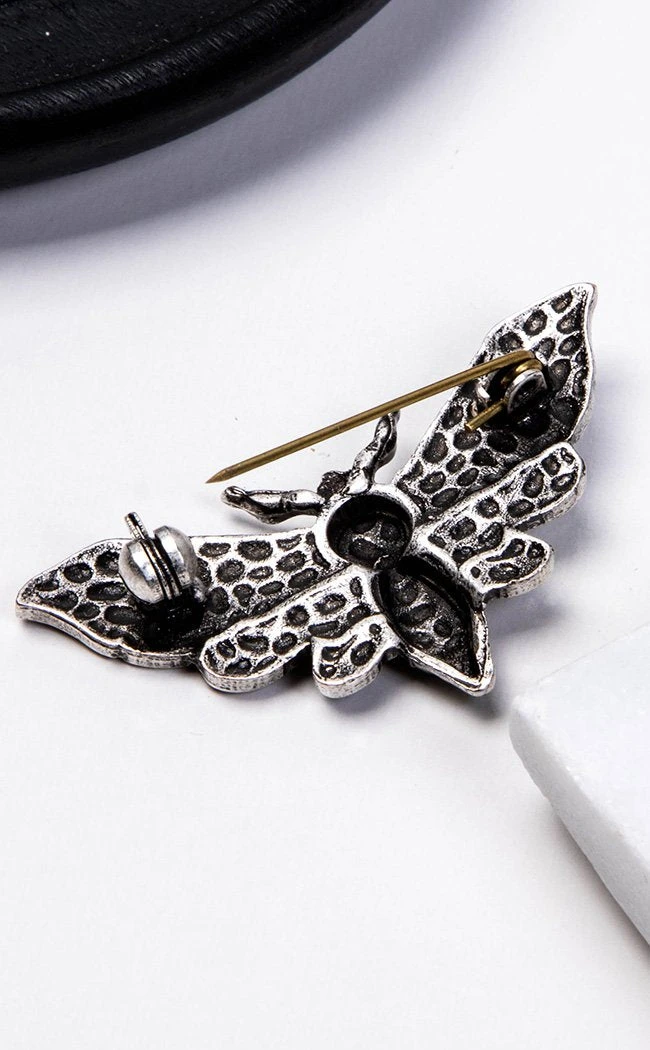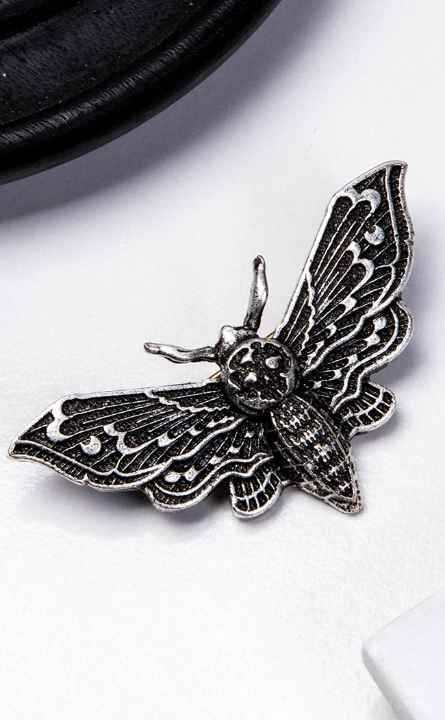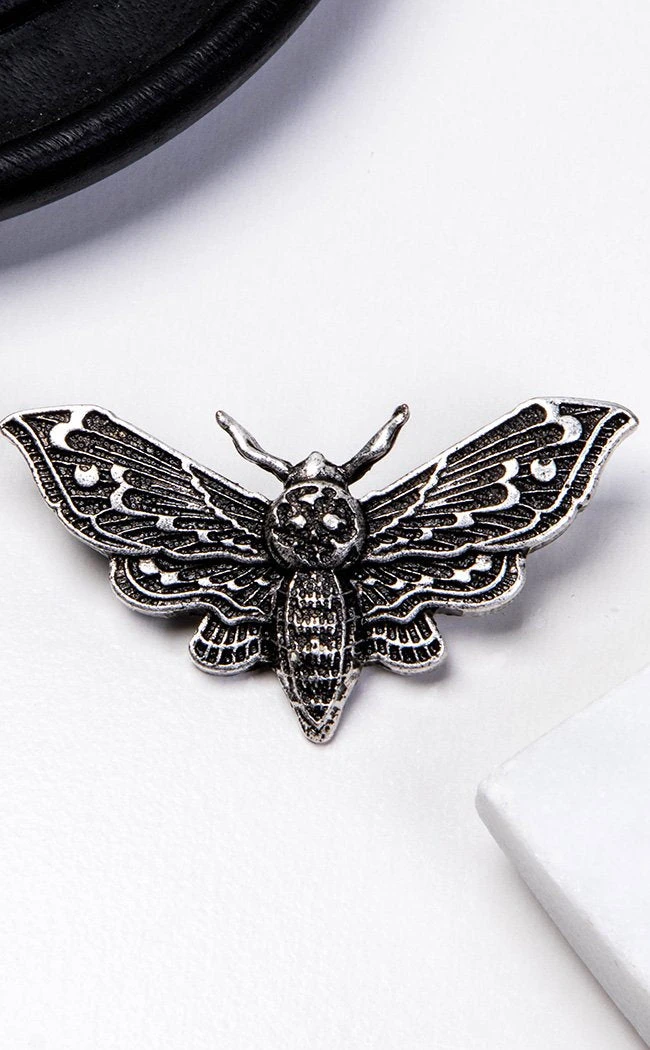 Add a little deadly glamour to your look. This wicked moth is finished in darkened silver and features delicate wings and a skull motif.