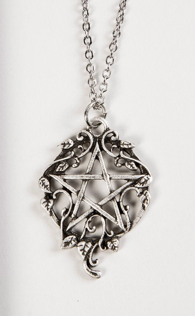 An upright pentagram forms this pendant, surrounded by filigree and touches of ivy as if plucked from an overgrown ruin. The pendant sits on a delicate silver chain, perfect for layering with other pieces to create a statement look.