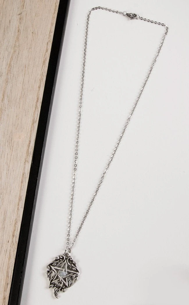 An upright pentagram forms this pendant, surrounded by filigree and touches of ivy as if plucked from an overgrown ruin. At the centre sits a smoky, grey bead for a touch of elegance formed from cool mists.