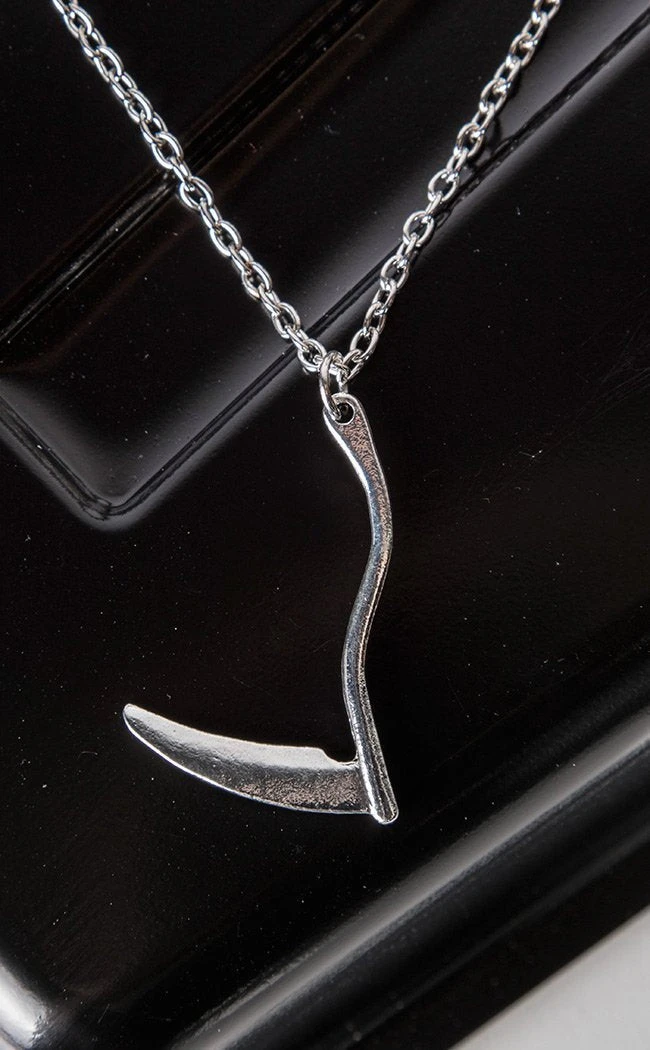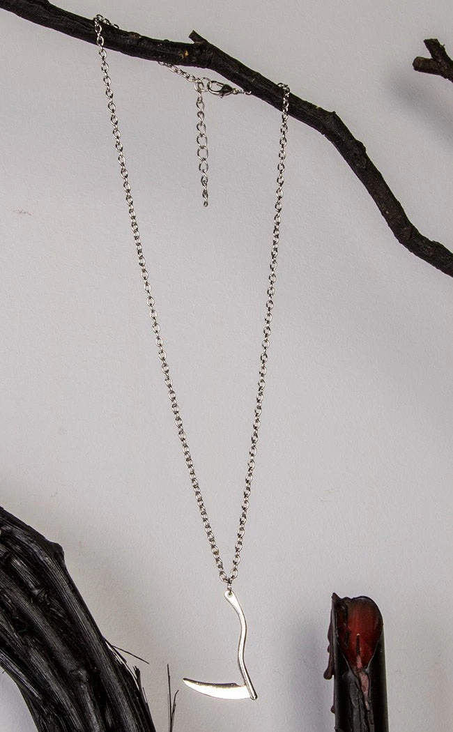 This deceptively simple pendant necklace is an easy way to dress a look up or down. An inverted scythe hangs from a delicate silver chain for stylish reapers and omens of doom alike.