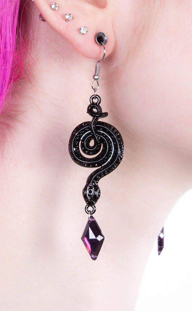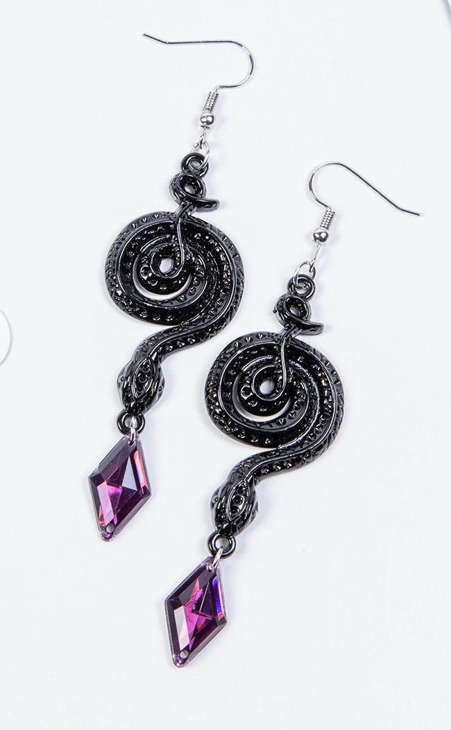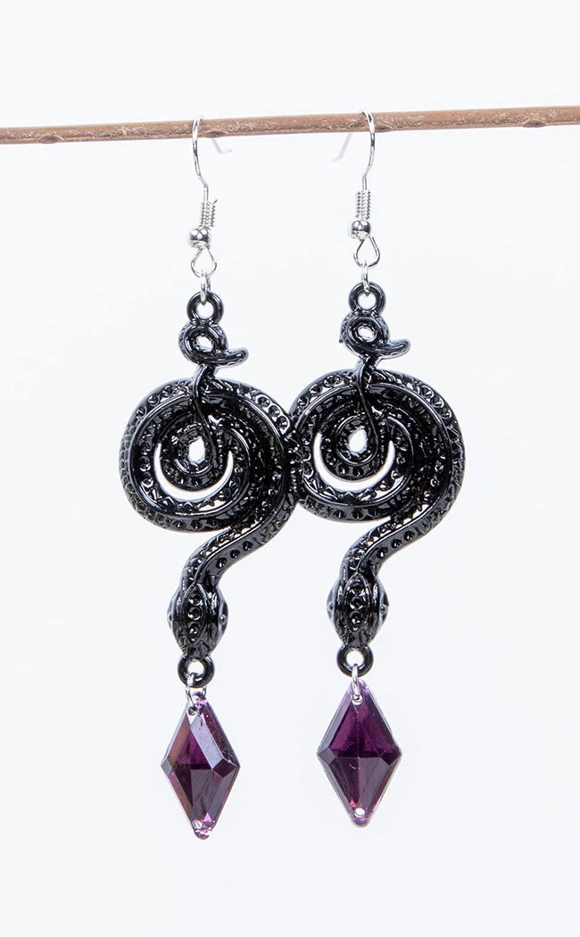 Add a musical touch to your look with these bewitching earrings! Two serpents hang in pendants, their tails coiling around two violet gems.