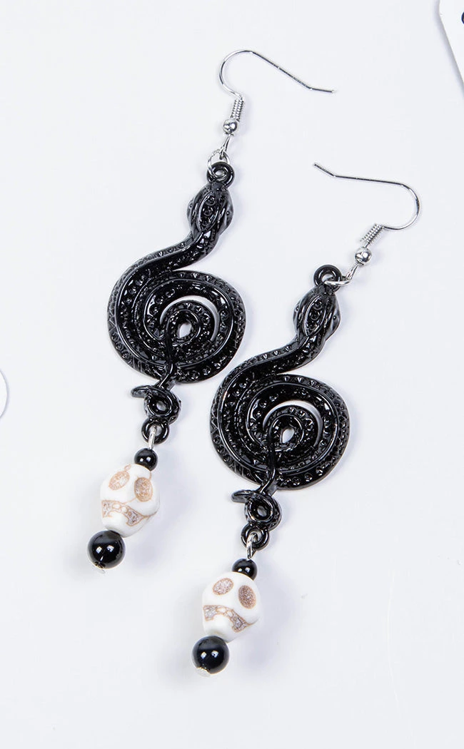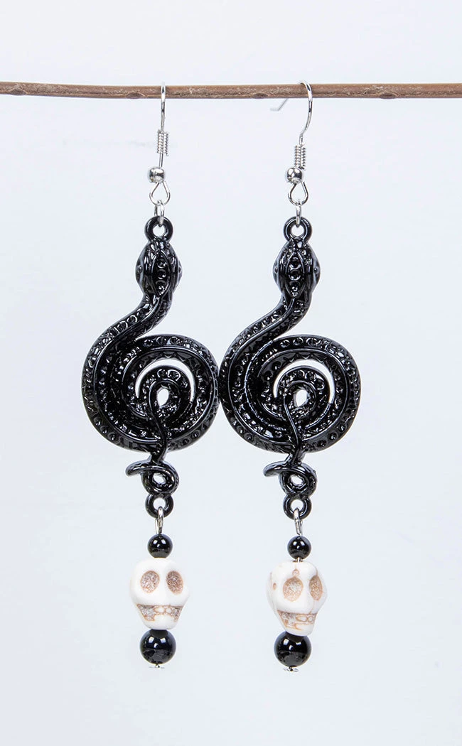 Add a musical touch to your look with these bewitching earrings! Two serpents hang in pendants, their tails coiling around beaded skull charms.