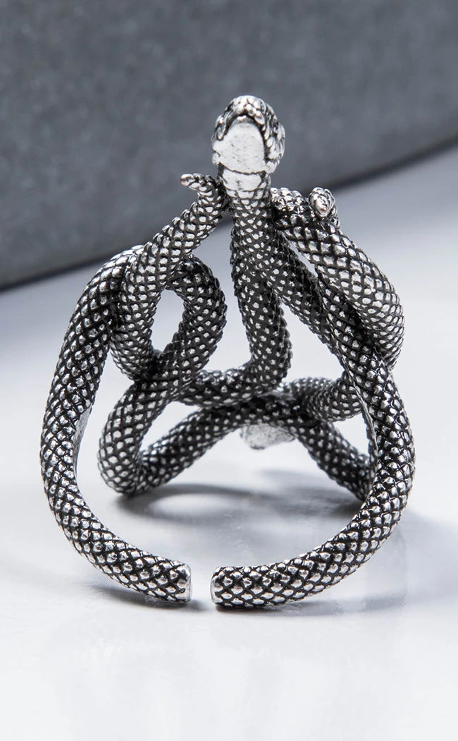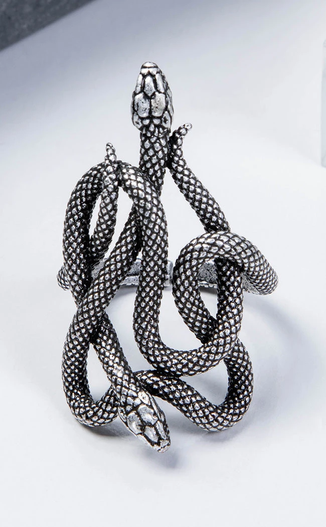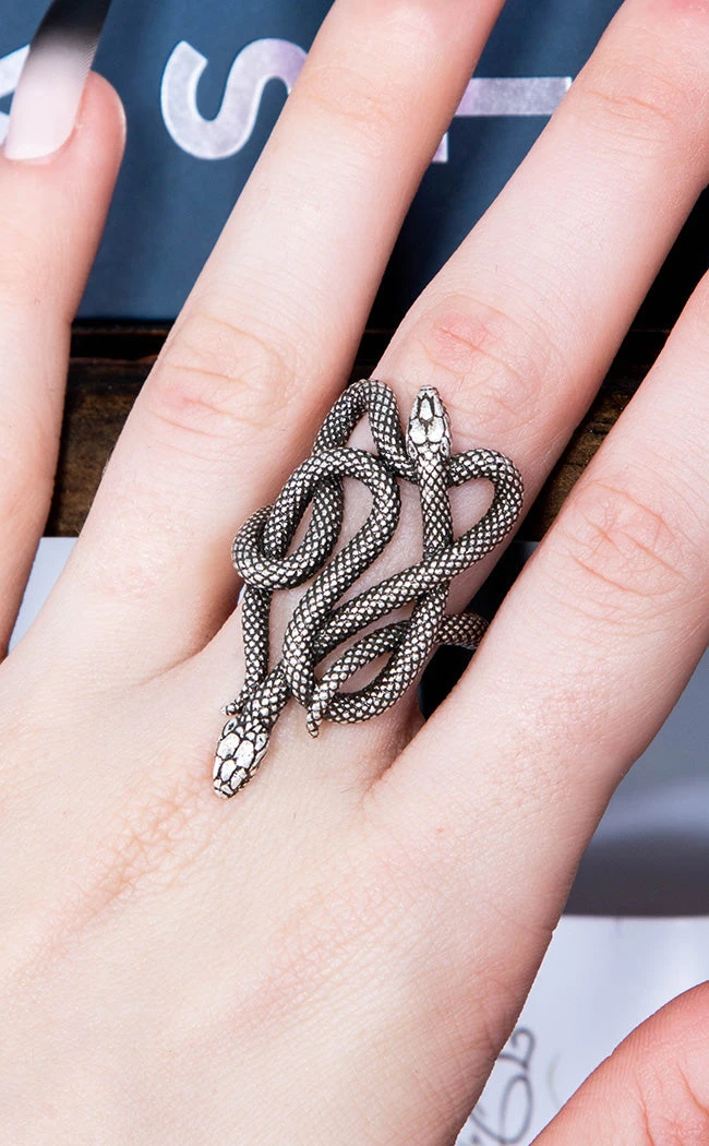 Couple goals! The Venomous Pair Ring features two snakes coiling around one another to form an oversized motif, finished in antique silver.