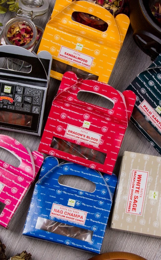These gorgeous smelling Satya incense backflow cones come in 7 scent variants, and are specifically designed for backflow burners, where the smoke flows downwards. They come in a close-able cardboard pouch with a handle. Each cone has a burning time of approx. 20 minutes.