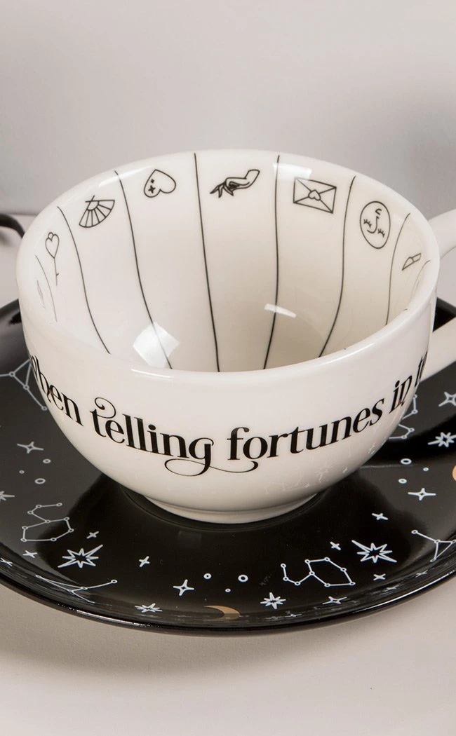 This unique teacup can both serve a generous brew and help you interpret the meaning of your tea leaves when you’re finished! The inside is printed with symbols you may see in the leaves while the outside is printed with the phrase “Mysterious Things I See When Telling Fortunes In Tea”. It comes with a contrasting black saucer printed with constellations and gold foil and an instructional leaflet on how to read tea leaves.