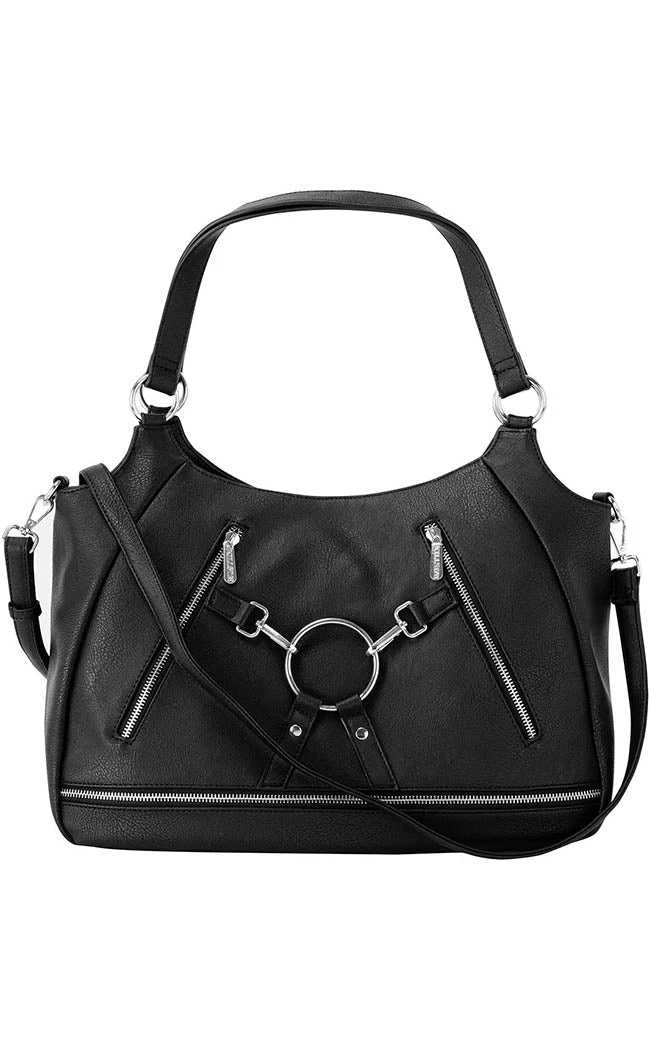 The Ramona Handbag is everything the everyday goth needs! A cute statement O ring harness detail sits on the front of this slouchy bag, bordered by decorative zips to add a punky edge. The inside has plenty of compartments for storing your unmentionables and you have the choice between handles and a removable shoulder strap for extra versatility.