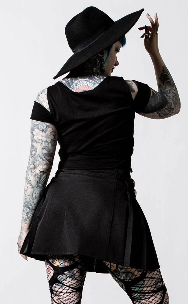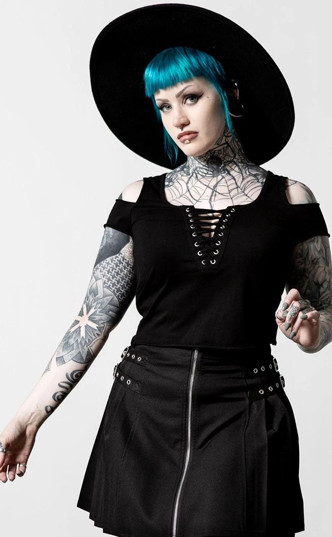 The Armageddon Crop Top is the perfect blend of retro chic and summergoth flair! Super soft stretch fabric drapes yer bod in a flattering fit, featuring cutout shoulders and a lace-up neckline.
