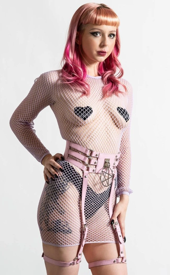 Strap in with the Baby Hex Suspender Belt! The triple-strap waist band features a huuuge pentagram charm for extra curse potential, hugging your middle with a comfortable elastic band. The suspender straps are fully adjustable and decked out with silver hardware.