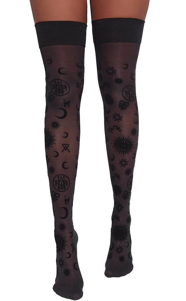 Spooky soulmates live on forever. Super sweet stockings with sheer and flock motif; purrfect for your black-on-black wardrobe.